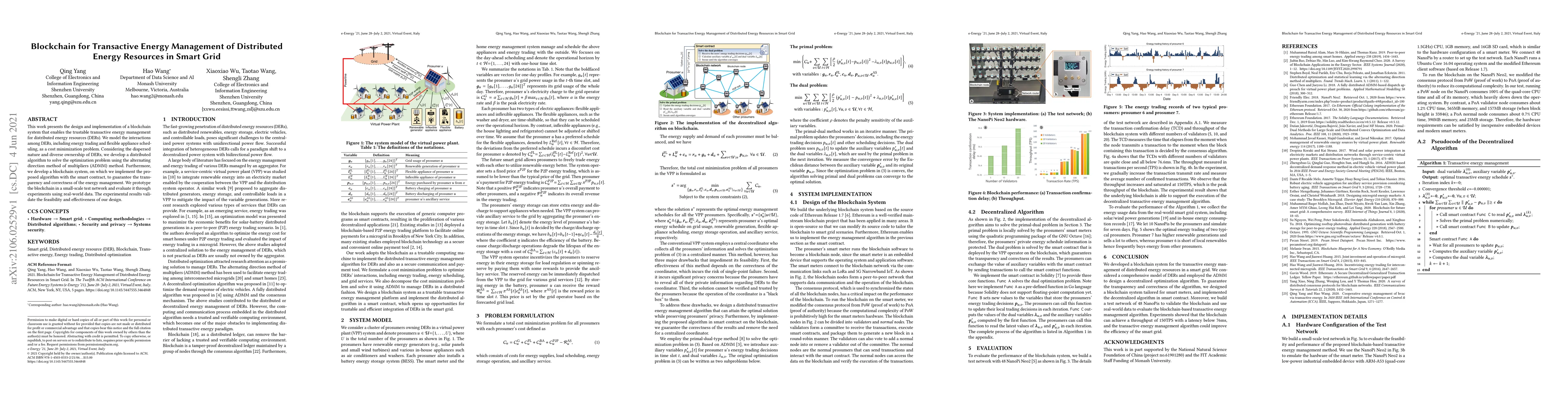 This paper designs and implements a blockchain system for managing distributed energy resources in smart grids, optimizing energy trading and appliance scheduling. The proposed algorithm, solved using ADMM, is implemented on a blockchain with smart contracts to ensure transparency and correctness, validated through experiments with real-world data.