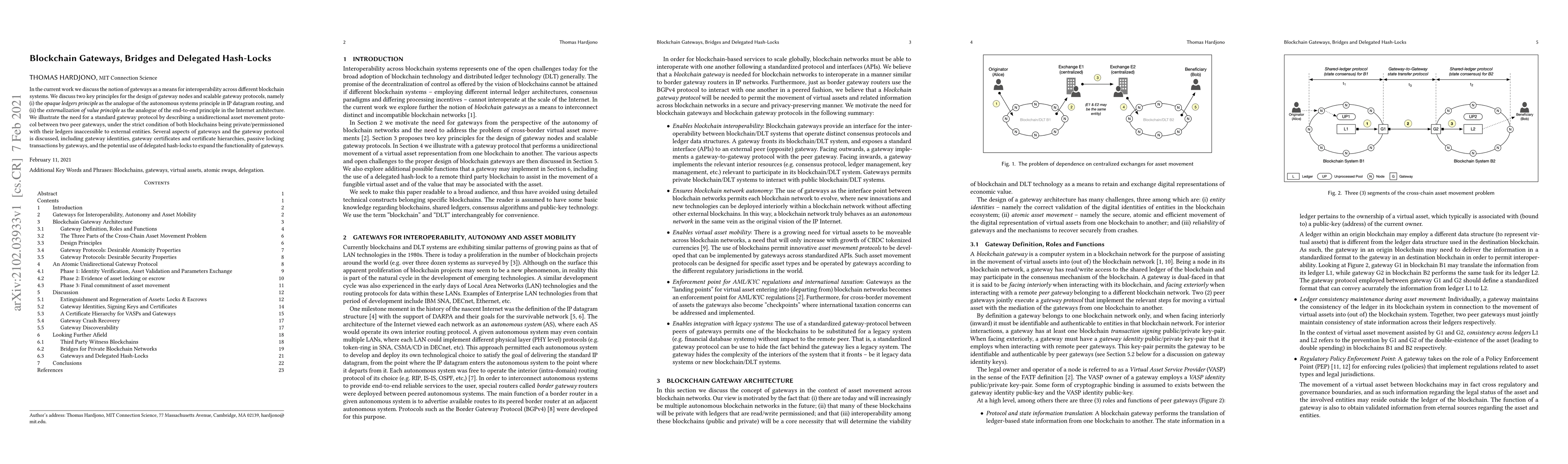 This paper explores the concept of blockchain gateways for interoperability between different blockchain systems, focusing on the opaque ledgers and externalization of value principles. It proposes a unidirectional asset movement protocol for private blockchains and discusses gateway identities, certificates, and the use of delegated hash-locks to enhance gateway functionality.
