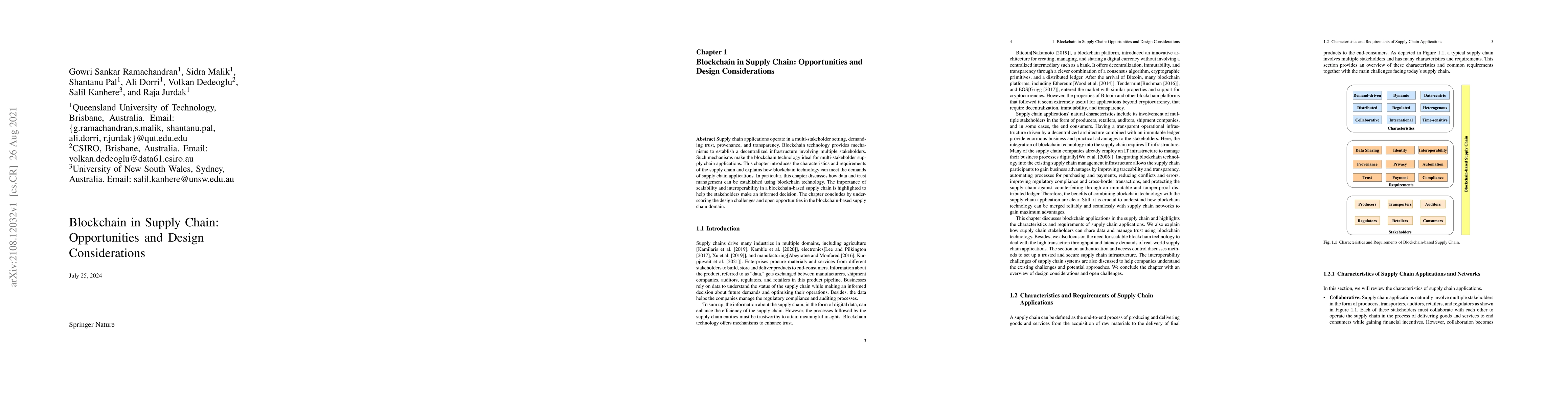 Supply chain applications operate in a multi-stakeholder setting, demanding trust, provenance, and transparency. Blockchain technology provides mechanisms to establish a decentralized infrastructure involving multiple stakeholders. Such mechanisms make the blockchain technology ideal for multi-stakeholder supply chain applications. This chapter introduces the characteristics and requirements of the supply chain and explains how blockchain technology can meet the demands of supply chain applications. In particular, this chapter discusses how data and trust management can be established using blockchain technology. The importance of scalability and interoperability in a blockchain-based supply chain is highlighted to help the stakeholders make an informed decision. The chapter concludes by underscoring the design challenges and open opportunities in the blockchain-based supply chain domain.