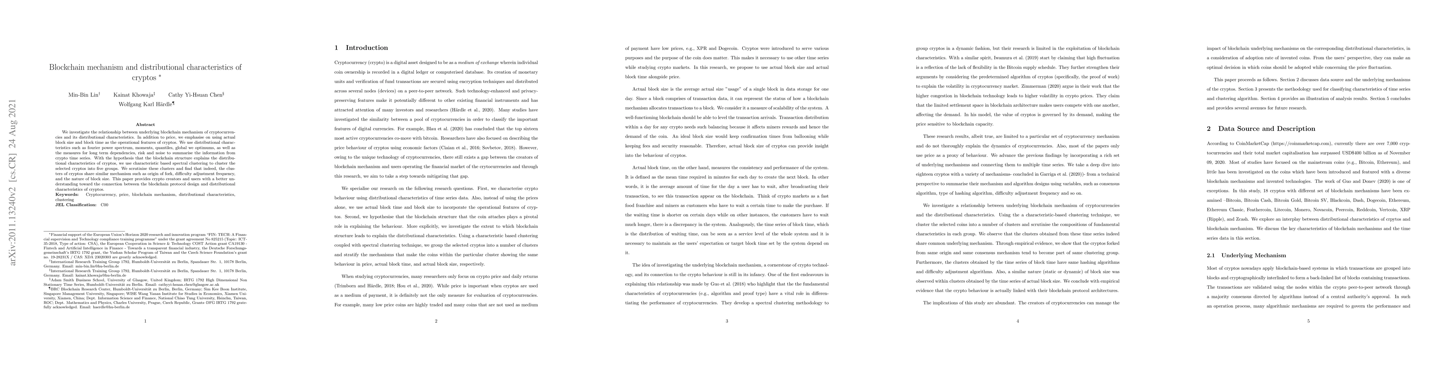 We investigate the relationship between underlying blockchain mechanism of cryptocurrencies and its distributional characteristics. In addition to price, we emphasise on using actual block size and block time as the operational features of cryptos. We use distributional characteristics such as fourier power spectrum, moments, quantiles, global we optimums, as well as the measures for long term dependencies, risk and noise to summarise the information from crypto time series. With the hypothesis that the blockchain structure explains the distributional characteristics of cryptos, we use characteristic based spectral clustering to cluster the selected cryptos into five groups. We scrutinise these clusters and find that indeed, the clusters of cryptos share similar mechanism such as origin of fork, difficulty adjustment frequency, and the nature of block size. This paper provides crypto creators and users with a better understanding toward the connection between the blockchain protocol design and distributional characteristics of cryptos.