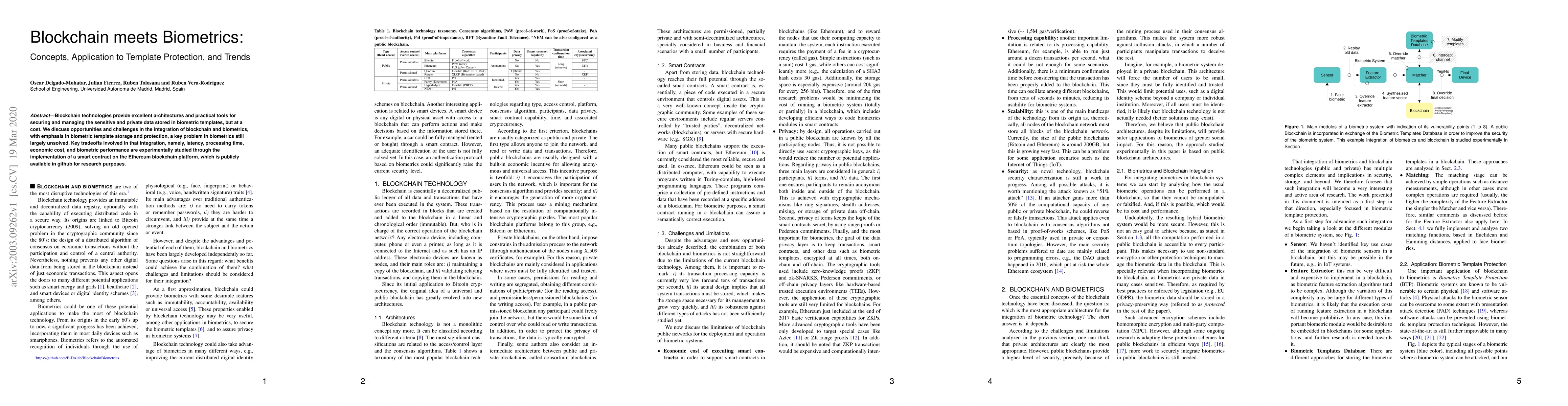Blockchain technologies provide excellent architectures and practical tools for securing and managing the sensitive and private data stored in biometric templates, but at a cost. We discuss opportunities and challenges in the integration of blockchain and biometrics, with emphasis in biometric template storage and protection, a key problem in biometrics still largely unsolved. Key tradeoffs involved in that integration, namely, latency, processing time, economic cost, and biometric performance are experimentally studied through the implementation of a smart contract on the Ethereum blockchain platform, which is publicly available in github for research purposes.