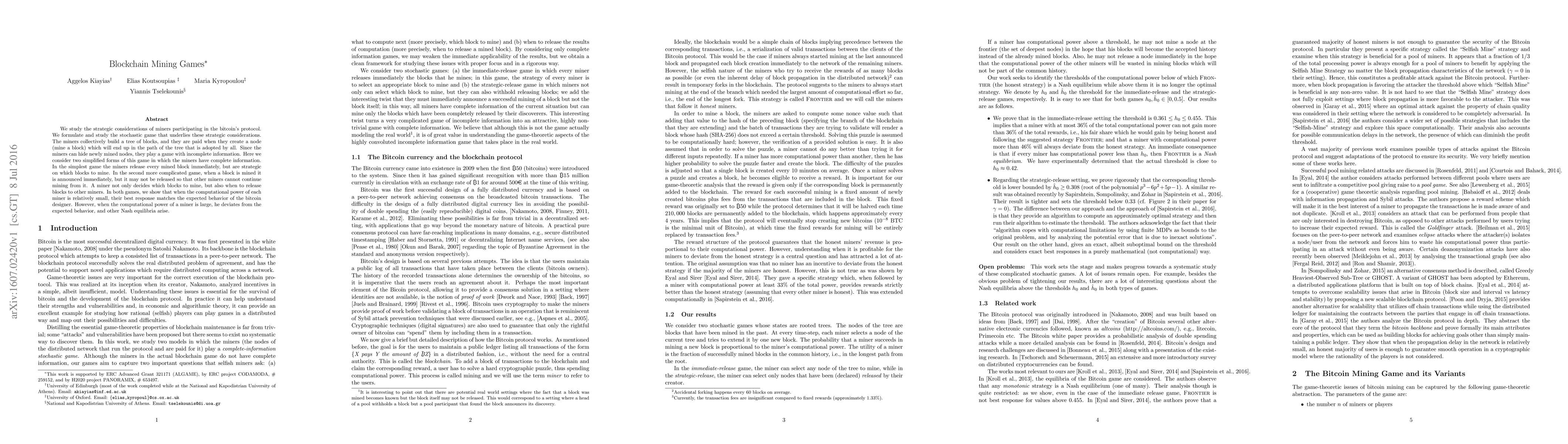 We study the strategic considerations of miners participating in the bitcoin's protocol. We formulate and study the stochastic game that underlies these strategic considerations. The miners collectively build a tree of blocks, and they are paid when they create a node (mine a block) which will end up in the path of the tree that is adopted by all. Since the miners can hide newly mined nodes, they play a game with incomplete information. Here we consider two simplified forms of this game in which the miners have complete information. In the simplest game the miners release every mined block immediately, but are strategic on which blocks to mine. In the second more complicated game, when a block is mined it is announced immediately, but it may not be released so that other miners cannot continue mining from it. A miner not only decides which blocks to mine, but also when to release blocks to other miners. In both games, we show that when the computational power of each miner is relatively small, their best response matches the expected behavior of the bitcoin designer. However, when the computational power of a miner is large, he deviates from the expected behavior, and other Nash equilibria arise.