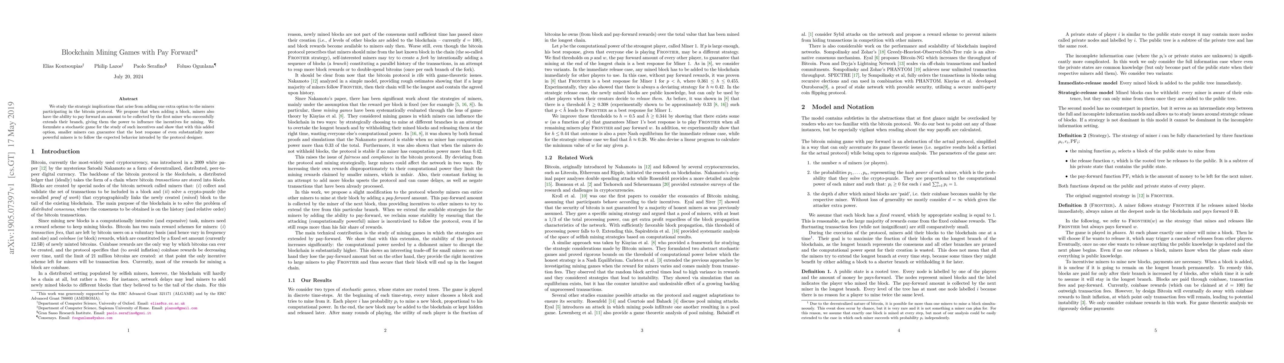 Researchers studied the impact of adding a pay-forward option to bitcoin mining games, finding that it allows smaller miners to influence powerful miners' behavior and maintain expected protocol incentives.