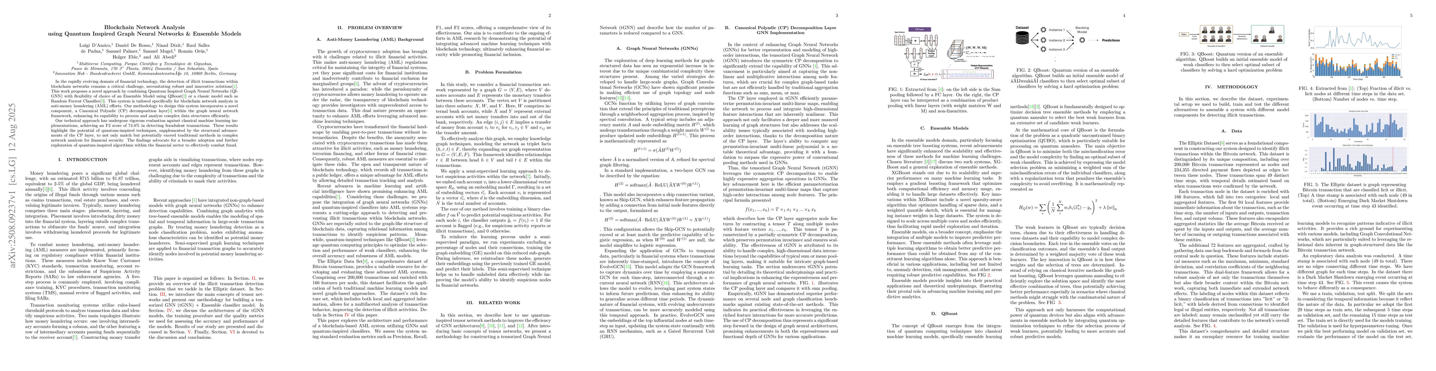 In the rapidly evolving domain of financial technology, the detection of illicit transactions within blockchain networks remains a critical challenge, necessitating robust and innovative solutions. This work proposes a novel approach by combining Quantum Inspired Graph Neural Networks (QI-GNN) with flexibility of choice of an Ensemble Model using QBoost or a classic model such as Random Forrest Classifier. This system is tailored specifically for blockchain network analysis in anti-money laundering (AML) efforts. Our methodology to design this system incorporates a novel component, a Canonical Polyadic (CP) decomposition layer within the graph neural network framework, enhancing its capability to process and analyze complex data structures efficiently. Our technical approach has undergone rigorous evaluation against classical machine learning implementations, achieving an F2 score of 74.8% in detecting fraudulent transactions. These results highlight the potential of quantum-inspired techniques, supplemented by the structural advancements of the CP layer, to not only match but potentially exceed traditional methods in complex network analysis for financial security. The findings advocate for a broader adoption and further exploration of quantum-inspired algorithms within the financial sector to effectively combat fraud.
