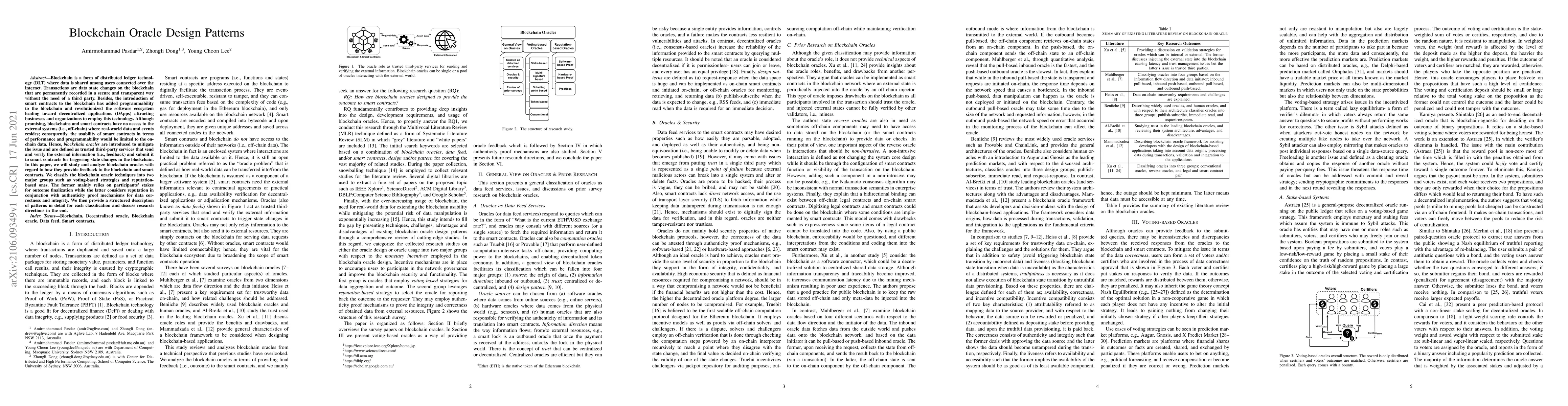 This paper analyzes blockchain oracle design patterns to improve the usability of smart contracts with external data. It classifies oracles into voting-based and reputation-based strategies, providing a structured description of patterns for each classification.