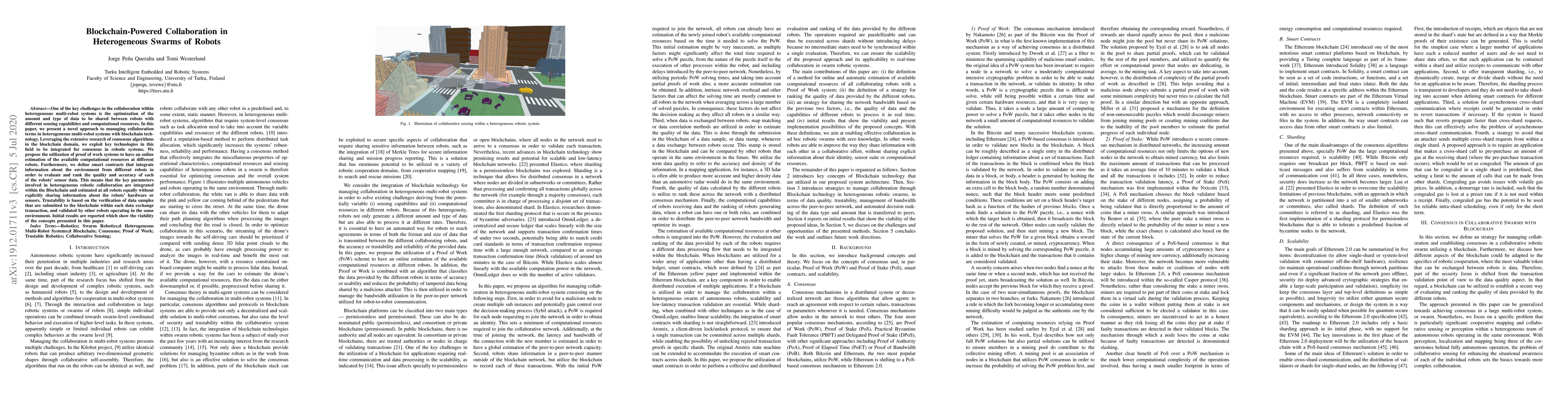 One of the key challenges in the collaboration within heterogeneous multi-robot systems is the optimization of the amount and type of data to be shared between robots with different sensing capabilities and computational resources. In this paper, we present a novel approach to managing collaboration terms in heterogeneous multi-robot systems with blockchain technology. Leveraging the extensive research of consensus algorithms in the blockchain domain, we exploit key technologies in this field to be integrated for consensus in robotic systems. We propose the utilization of proof of work systems to have an online estimation of the available computational resources at different robots. Furthermore, we define smart contracts that integrate information about the environment from different robots in order to evaluate and rank the quality and accuracy of each of the robots' sensor data. This means that the key parameters involved in heterogeneous robotic collaboration are integrated within the Blockchain and estimated at all robots equally without explicitly sharing information about the robots' hardware or sensors. Trustability is based on the verification of data samples that are submitted to the blockchain within each data exchange transaction and validated by other robots operating in the same environment. Initial results are reported which show the viability of the concepts presented in this paper.
