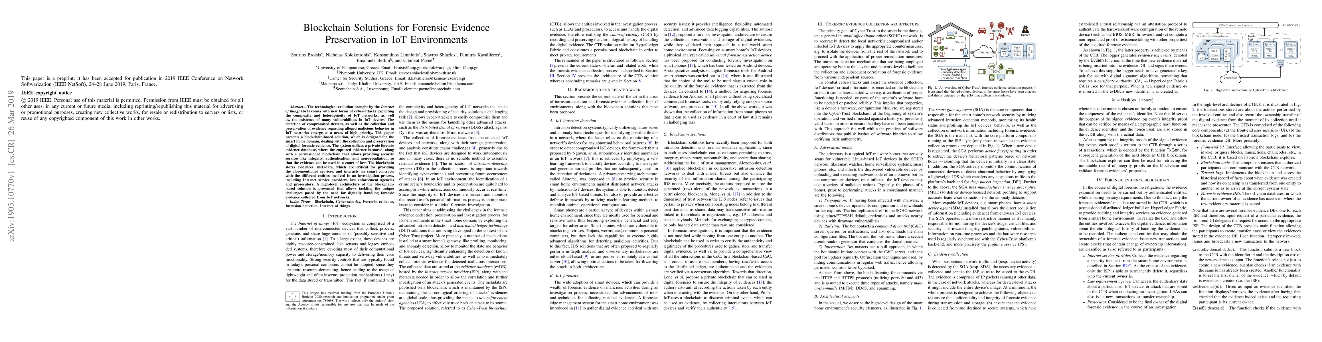 This paper proposes a blockchain-based system for preserving digital forensic evidence in IoT environments, focusing on smart homes. The system uses a private blockchain for secure storage and integrity of evidence, interacting with various investigation entities via smart contracts.