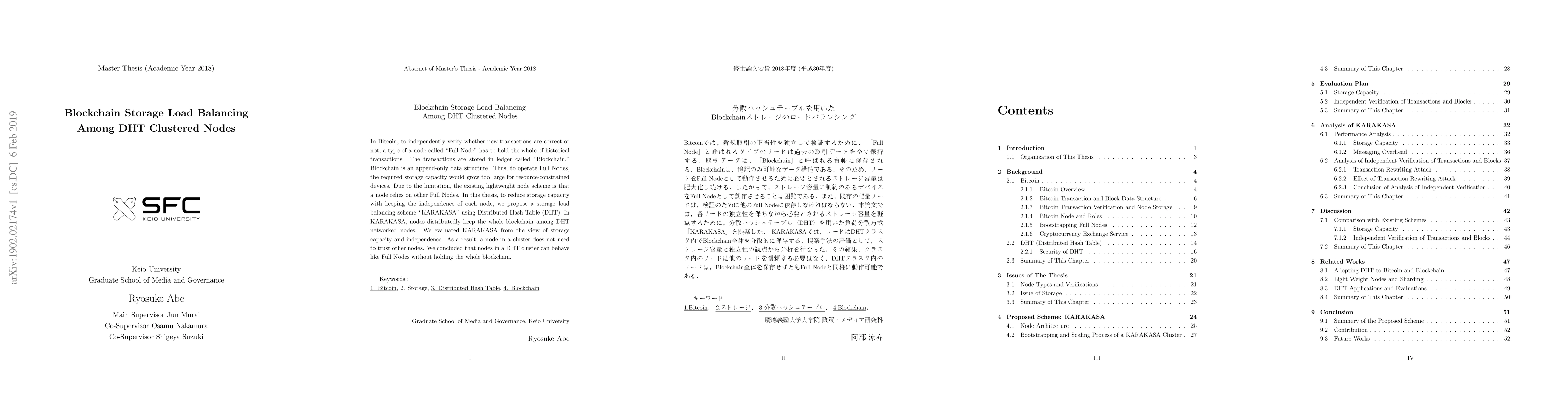 In Bitcoin, to independently verify whether new transactions are correct or not, a type of a node called "Full Node" has to hold the whole of historical transactions. The transactions are stored in ledger called "Blockchain. " Blockchain is an append-only data structure. Thus, to operate Full Nodes, the required storage capacity would grow too large for resource-constrained devices. Due to the limitation, the existing lightweight node scheme is that a node relies on other Full Nodes. In this thesis, to reduce storage capacity with keeping the independence of each node, we propose a storage load balancing scheme "KARAKASA" using Distributed Hash Table (DHT). In KARAKASA, nodes distributedly keep the whole blockchain among DHT networked nodes. We evaluated KARAKASA from the view of storage capacity and independence. As a result, a node in a cluster does not need to trust other nodes. We concluded that nodes in a DHT cluster can behave like Full Nodes without holding the whole blockchain.