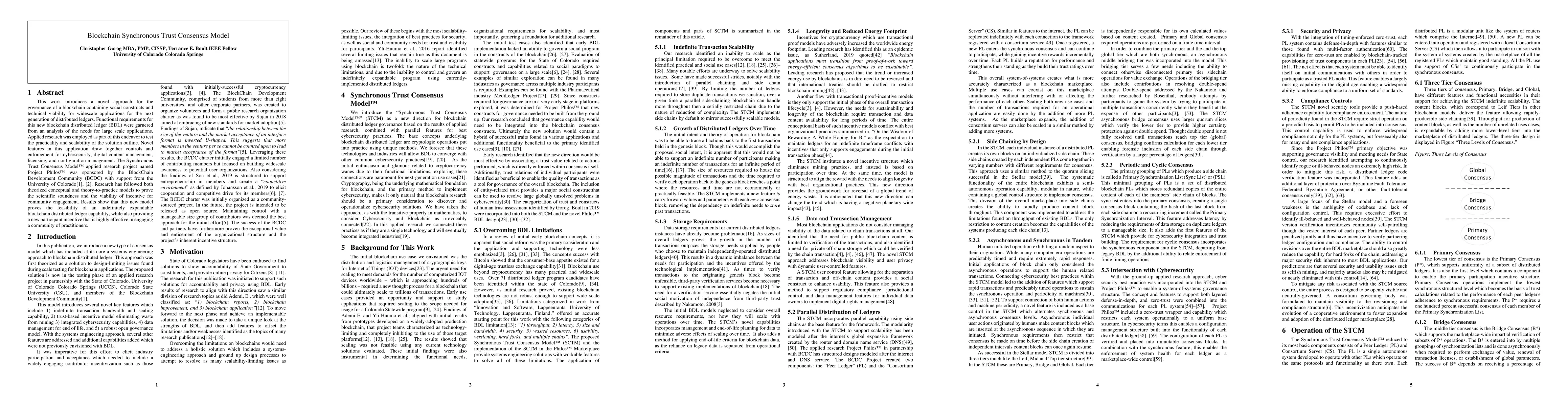 This work introduces a novel approach for the governance of a blockchain containing social constructs and technical viability for widescale applications for the next generation of distributed ledgers. Functional requirements for this new blockchain distributed ledger (BDL) were garnered from an analysis of the needs for large-scale applications. Applied research was employed as part of this endeavor to test the practicality and scalability of the solution outline. Novel features in this application draw together controls and enforcement for cybersecurity, digital content management, licensing, and configuration management. The Synchronous Trust Consensus Model applied research project named Project Philos was sponsored by the BlockChain Development Community (BCDC) with support from the University of Colorado. Research has followed both theorized conceptual and theory-to-practice models to prove the scientific soundness and the viability of incentive for community engagement. Results show that this new model proves the feasibility of an indefinitely expandable blockchain distributed ledger capability, while also providing a new participant incentive that is highly effective in engaging a community of practitioners.