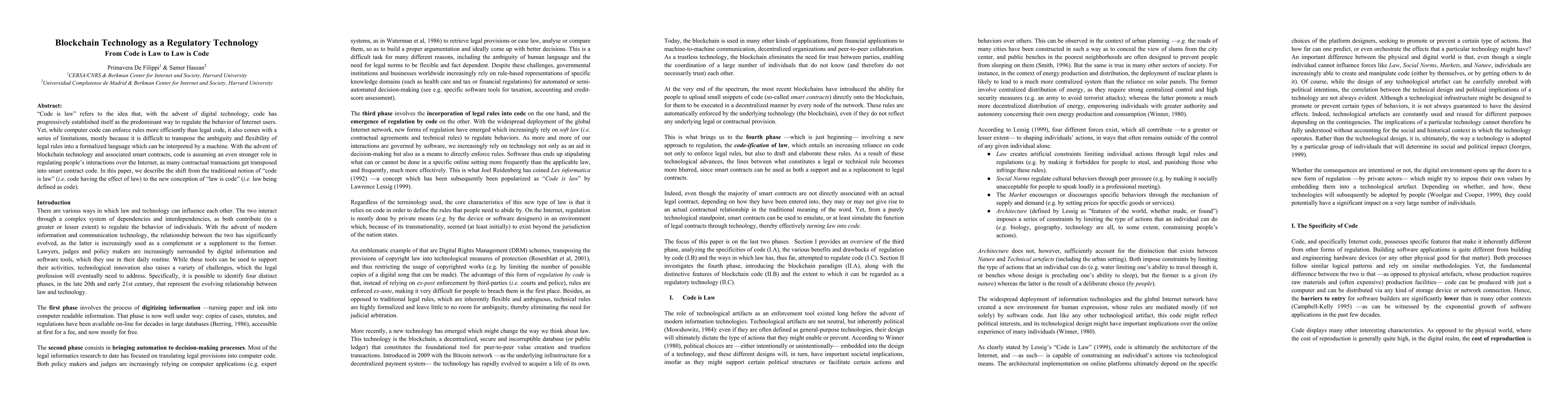 This paper explores the evolution of regulation from "code is law" to "law is code" with the rise of blockchain technology. It highlights how smart contracts are transforming traditional legal frameworks into machine-readable code, though it also notes the challenges in translating legal ambiguity into formal code.
