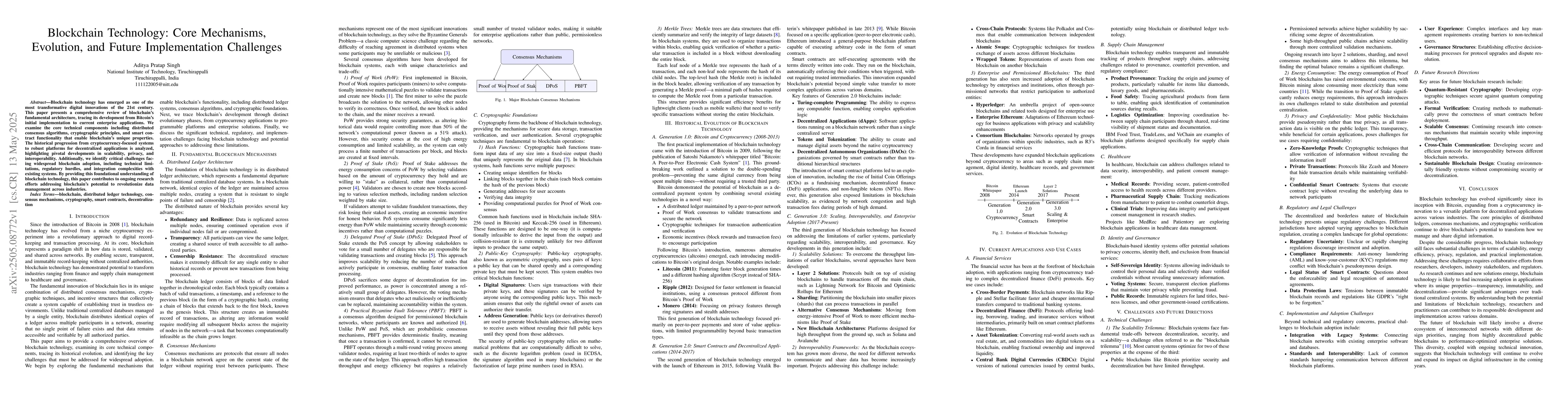 This paper reviews blockchain technology's core mechanisms, evolution, and future implementation challenges, highlighting its potential to revolutionize data management across industries. It identifies key findings on technical components, historical progression, scalability, privacy, and interoperability, as well as challenges to widespread adoption.