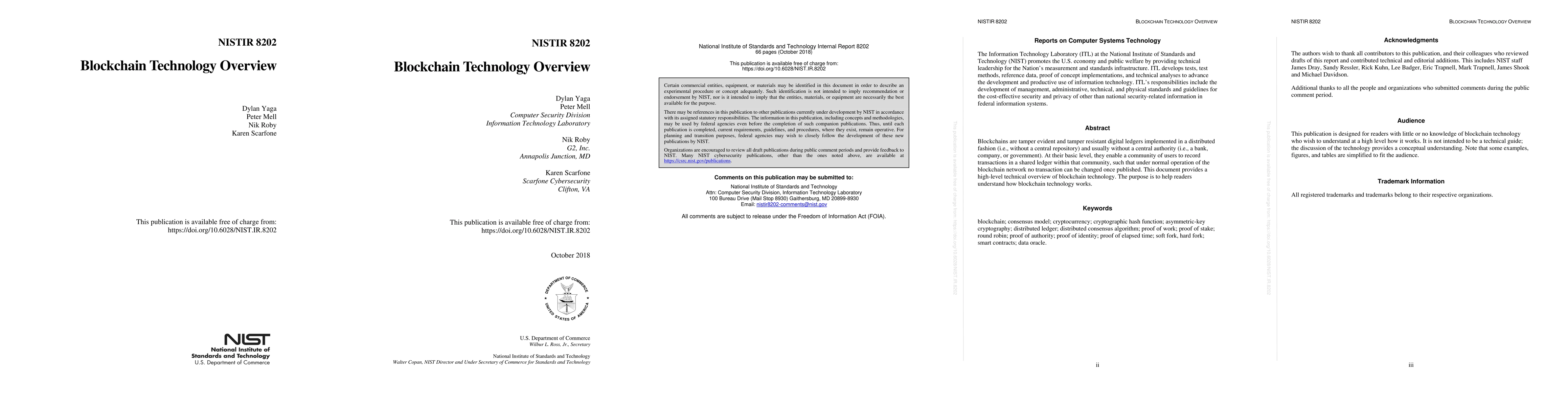 Blockchains are tamper evident and tamper resistant digital ledgers implemented in a distributed fashion (i.e., without a central repository) and usually without a central authority (i.e., a bank, company, or government). At their basic level, they enable a community of users to record transactions in a shared ledger within that community, such that under normal operation of the blockchain network no transaction can be changed once published. This document provides a high-level technical overview of blockchain technology. The purpose is to help readers understand how blockchain technology works.