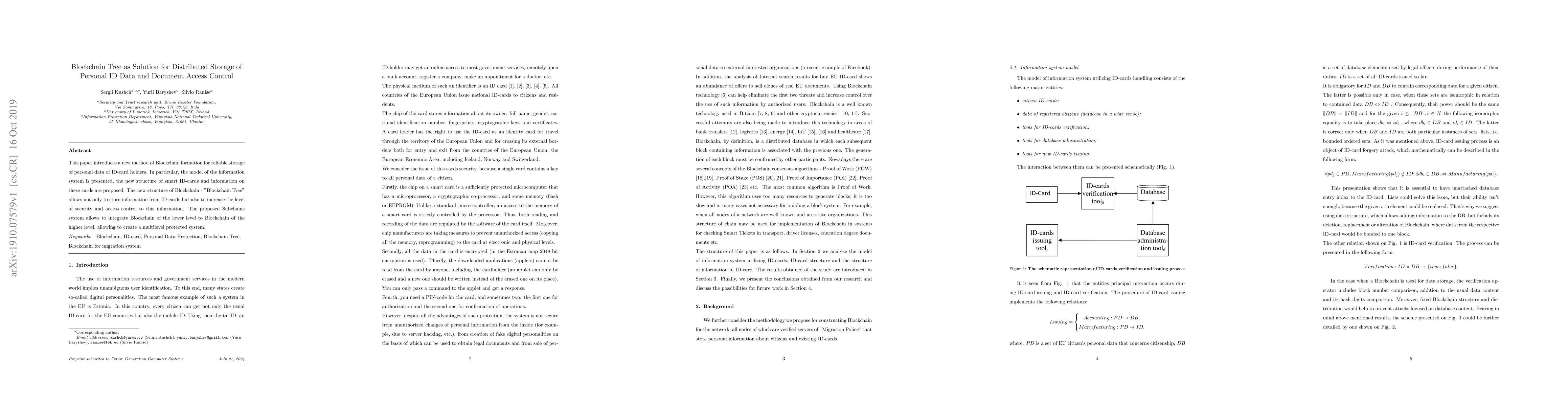 This paper introduces a new method of Blockchain formation for reliable storage of personal data of ID-card holders. In particular, the model of the information system is presented, the new structure of smart ID-cards and information on these cards are proposed. The new structure of Blockchain - "Blockchain Tree" allows not only to store information from ID-cards but also to increase the level of security and access control to this information. The proposed Subchains system allows to integrate Blockchain of the lower level to Blockchain of the higher level, allowing to create a multilevel protected system.