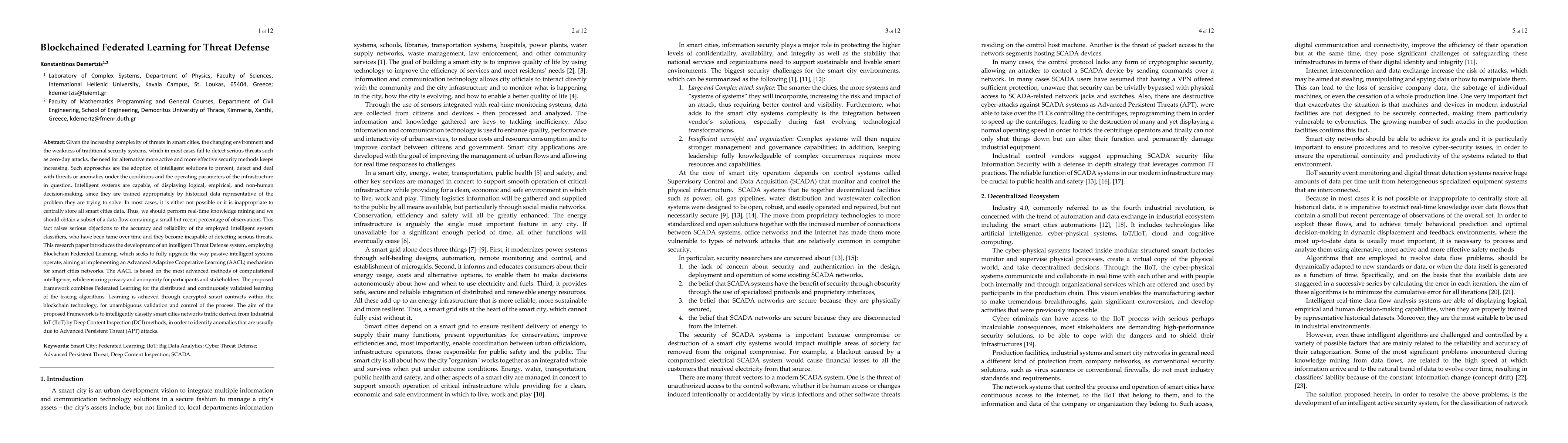 Given the increasing complexity of threats in smart cities, the changing environment, and the weakness of traditional security systems, which in most cases fail to detect serious threats such as zero-day attacks, the need for alternative more active and more effective security methods keeps increasing. Such approaches are the adoption of intelligent solutions to prevent, detect and deal with threats or anomalies under the conditions and the operating parameters of the infrastructure in question. This research paper introduces the development of an intelligent Threat Defense system, employing Blockchain Federated Learning, which seeks to fully upgrade the way passive intelligent systems operate, aiming at implementing an Advanced Adaptive Cooperative Learning (AACL) mechanism for smart cities networks. The AACL is based on the most advanced methods of computational intelligence while ensuring privacy and anonymity for participants and stakeholders. The proposed framework combines Federated Learning for the distributed and continuously validated learning of the tracing algorithms. Learning is achieved through encrypted smart contracts within the blockchain technology, for unambiguous validation and control of the process. The aim of the proposed Framework is to intelligently classify smart cities networks traffic derived from Industrial IoT (IIoT) by Deep Content Inspection (DCI) methods, in order to identify anomalies that are usually due to Advanced Persistent Threat (APT) attacks.