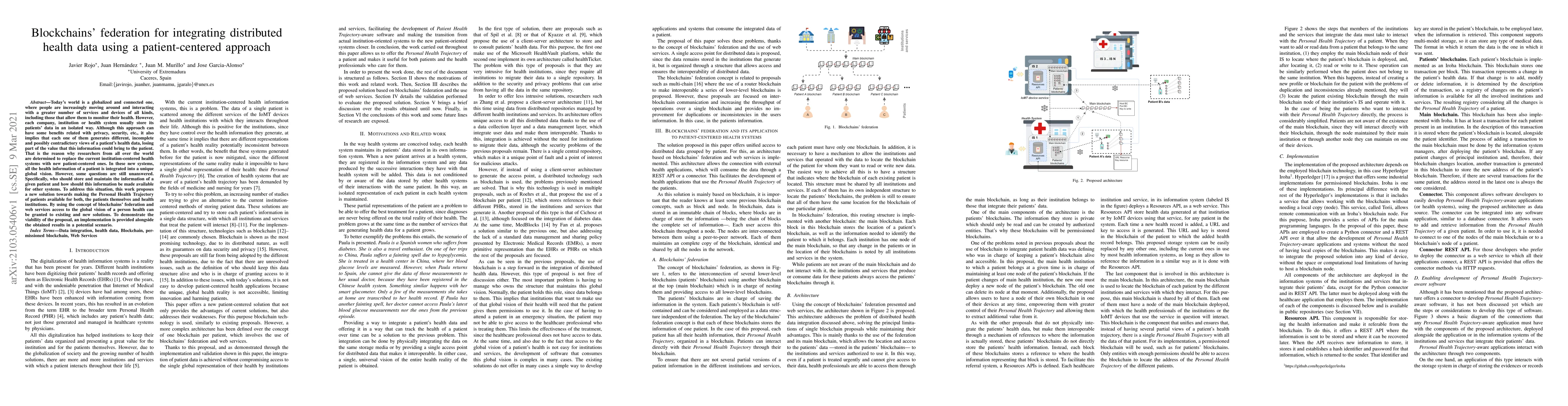 Today's world is a globalized and connected one, where people are increasingly moving around and interacting with a greater number of services and devices of all kinds, including those that allow them to monitor their health. However, each company, institution or health system usually store its patients' data in an isolated way. Although this approach can have some benefits related with privacy, security, etc., it also implies that each one of them generates different, incomplete and possibly contradictory views of a patient's health data, losing part of the value that this information could bring to the patient. That is the reason why researchers from all over the world are determined to replace the current institution-centered health systems with new patient-centered ones. In these new systems, all the health information of a patient is integrated into a unique global vision. However, some questions are still unanswered. Specifically, who should store and maintain the information of a given patient and how should this information be made available for other systems. To address this situation, this work proposes a new solution towards making the Personal Health Trajectory of patients available for both, the patients themselves and health institutions. By using the concept of blockchains' federation and web services access to the global vision of a person health can be granted to existing and new solutions. To demonstrate the viability of the proposal, an implementation is provided alongside the obtained results in a potential scenario.