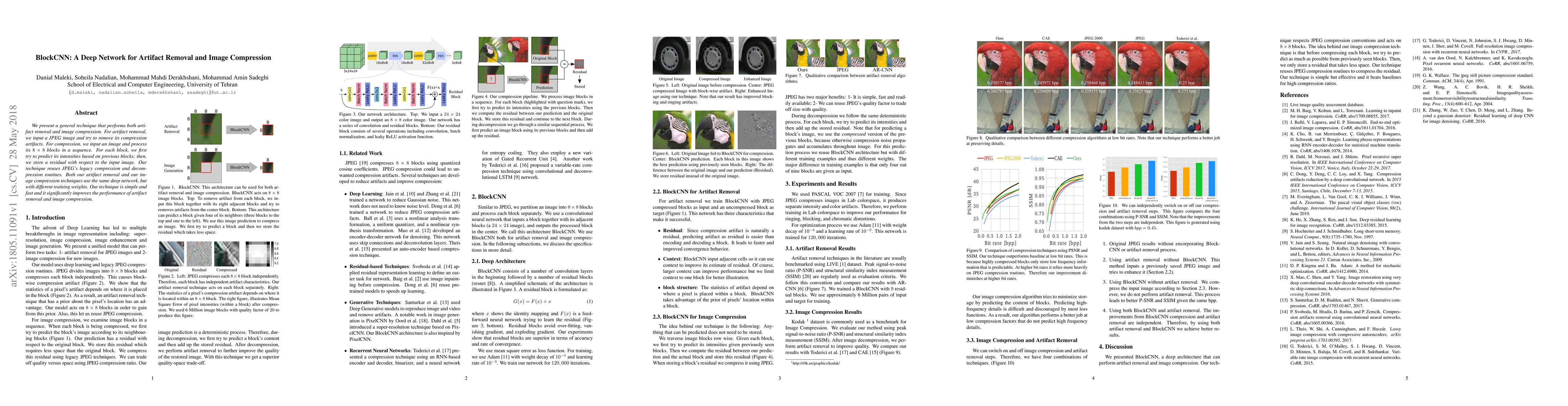 BlockCNN employs a deep network to simultaneously remove JPEG compression artifacts and compress images by predicting block intensities and storing residuals. The method leverages existing JPEG routines and uses distinct training weights for each task, achieving superior performance in both artifact removal and compression.