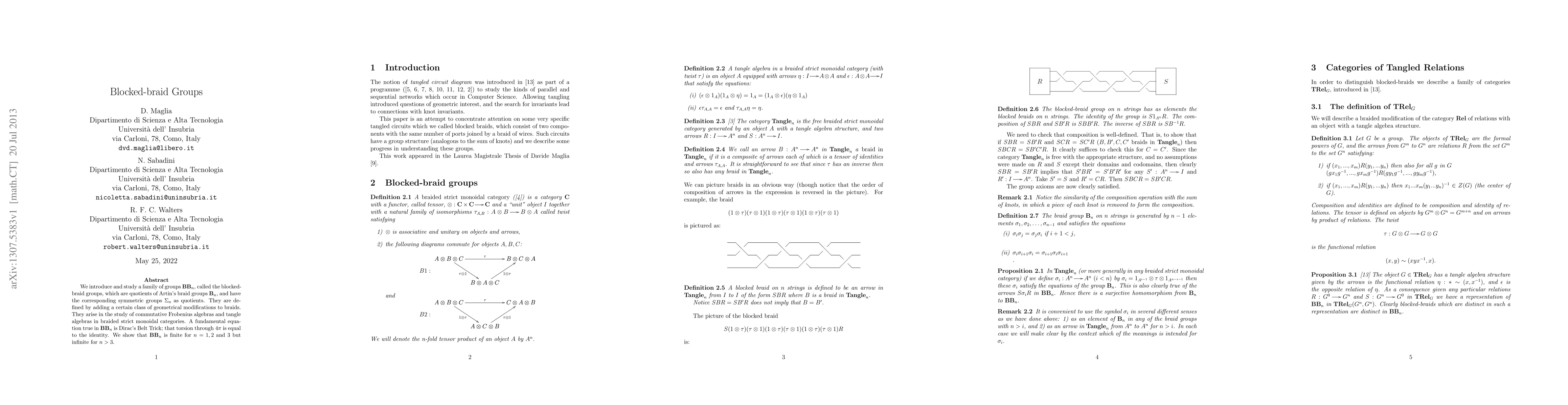 The paper introduces blocked-braid groups $\mathbf{BB}_n$, quotients of Artin's braid groups $\mathbf{B}_n$ with symmetric groups $\Sigma_n$ as quotients. These groups, defined by specific geometrical modifications, are finite for $n \leq 3$ but infinite for $n > 3$.