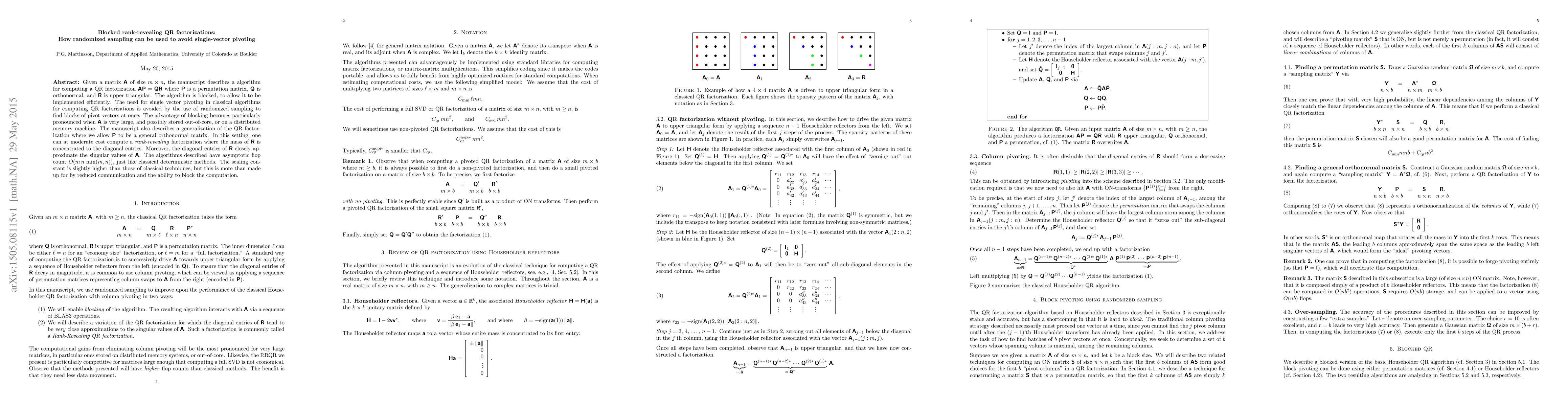 This paper presents a blocked algorithm for QR factorization that avoids single-vector pivoting through randomized sampling, enabling efficient computation on large matrices, especially when stored out-of-core or on distributed systems. The method achieves an asymptotic flop count comparable to classical methods but with reduced communication costs.
