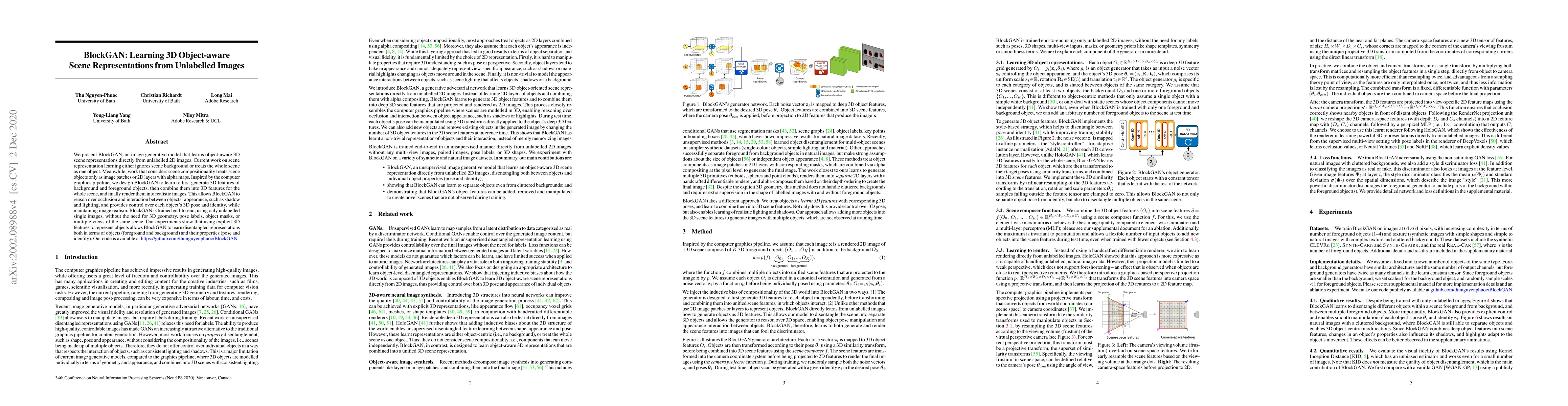 BlockGAN is an image generative model that learns 3D object-aware scene representations from unlabelled 2D images, generating 3D features for both background and foreground objects to create realistic images while reasoning about occlusion and interactions. It achieves disentangled representations of objects and their properties without requiring 3D geometry or object masks.
