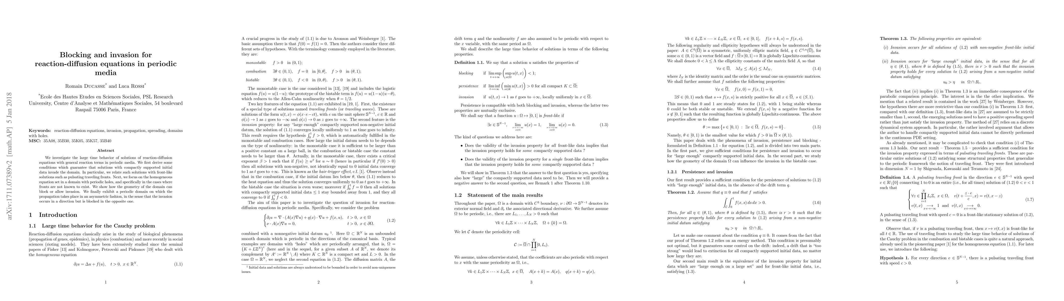 This paper examines the long-term behavior of reaction-diffusion equations in periodic media, deriving conditions for solution invasion and relating them to front-like solutions. It also explores how domain geometry can block or facilitate invasion, with a specific focus on asymmetric propagation in periodic domains.