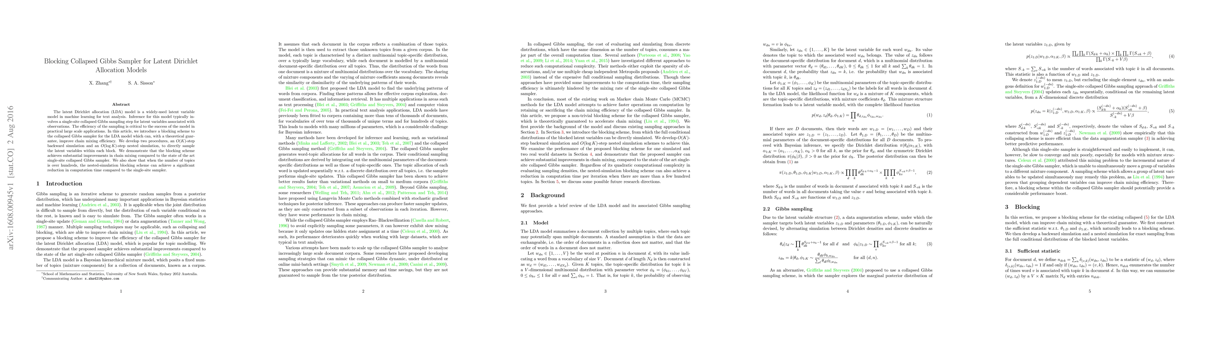 This paper introduces a blocking scheme for the collapsed Gibbs sampler in latent Dirichlet allocation (LDA) models to improve sampling efficiency. The proposed O(K)-step backward and O(log K)-step nested simulations within blocks significantly enhance chain mixing and reduce computation time, especially for large numbers of topics.
