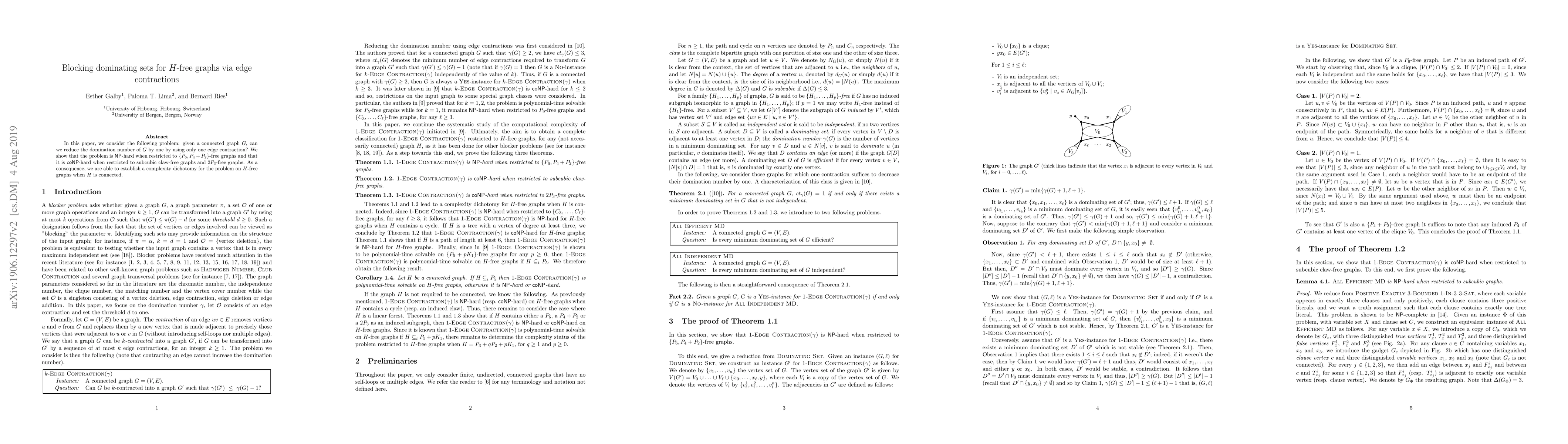 This paper investigates the complexity of reducing the domination number of a connected graph $G$ by one through a single edge contraction, demonstrating $\mathsf{NP}$-hardness for $\{P_6,P_4+P_2\}$-free graphs and $\mathsf{coNP}$-hardness for subcubic claw-free and $2P_3$-free graphs, leading to a complexity dichotomy for the problem on connected $H$-free graphs.