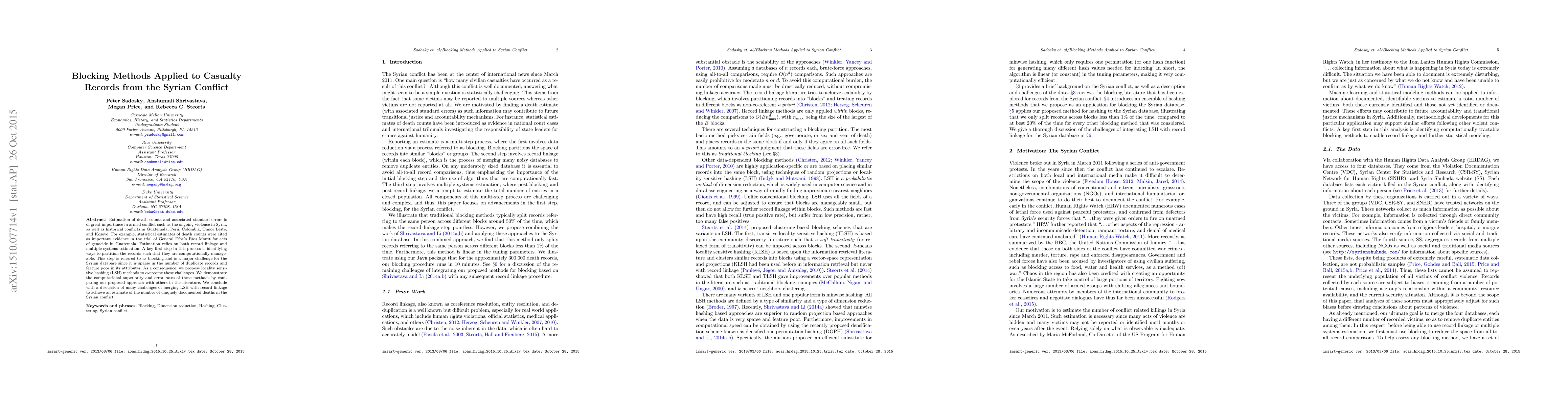 Estimation of death counts and associated standard errors is of great importance in armed conflict such as the ongoing violence in Syria, as well as historical conflicts in Guatemala, Per\'u, Colombia, Timor Leste, and Kosovo. For example, statistical estimates of death counts were cited as important evidence in the trial of General Efra\'in R\'ios Montt for acts of genocide in Guatemala. Estimation relies on both record linkage and multiple systems estimation. A key first step in this process is identifying ways to partition the records such that they are computationally manageable. This step is referred to as blocking and is a major challenge for the Syrian database since it is sparse in the number of duplicate records and feature poor in its attributes. As a consequence, we propose locality sensitive hashing (LSH) methods to overcome these challenges. We demonstrate the computational superiority and error rates of these methods by comparing our proposed approach with others in the literature. We conclude with a discussion of many challenges of merging LSH with record linkage to achieve an estimate of the number of uniquely documented deaths in the Syrian conflict.