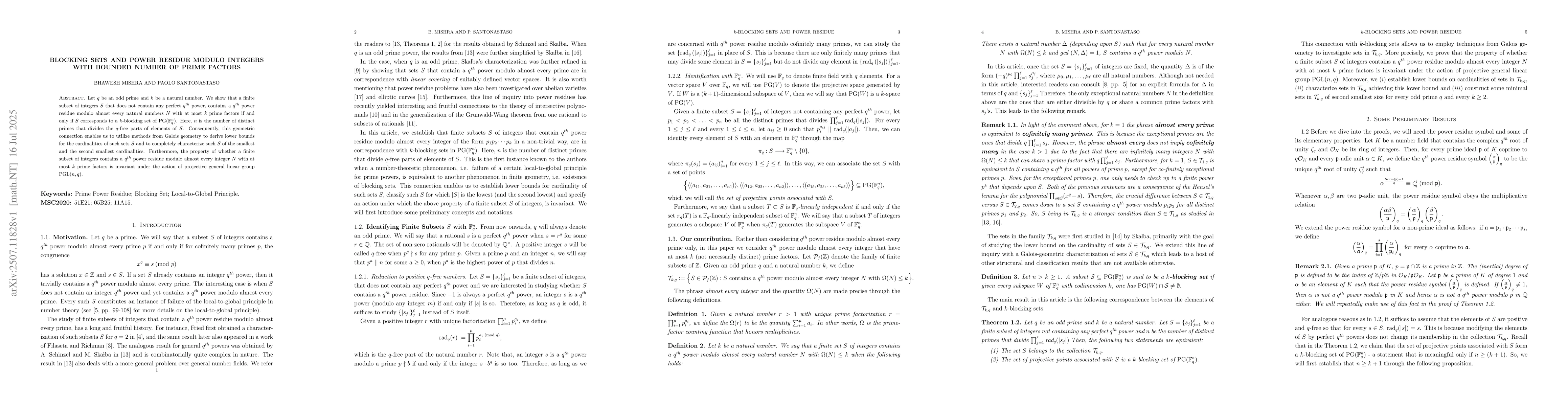 Let $q$ be an odd prime and $k$ be a natural number. We show that a finite subset of integers $S$ that does not contain any perfect $q^{th}$ power, contains a $q^{th}$ power residue modulo almost every natural numbers $N$ with at most $k$ prime factors if and only if $S$ corresponds to a $k$-blocking set of $\PG(\mathbb{F}_{q}^{n})$. Here, $n$ is the number of distinct primes that divides the $q$-free parts of elements of $S$. Consequently, this geometric connection enables us to utilize methods from Galois geometry to derive lower bounds for the cardinalities of such sets $S$ and to completely characterize such $S$ of the smallest and the second smallest cardinalities. Furthermore, the property of whether a finite subset of integers contains a $q^{th}$ power residue modulo almost every integer $N$ with at most $k$ prime factors is invariant under the action of projective general linear group $\mathrm{PGL}(n, q)$.