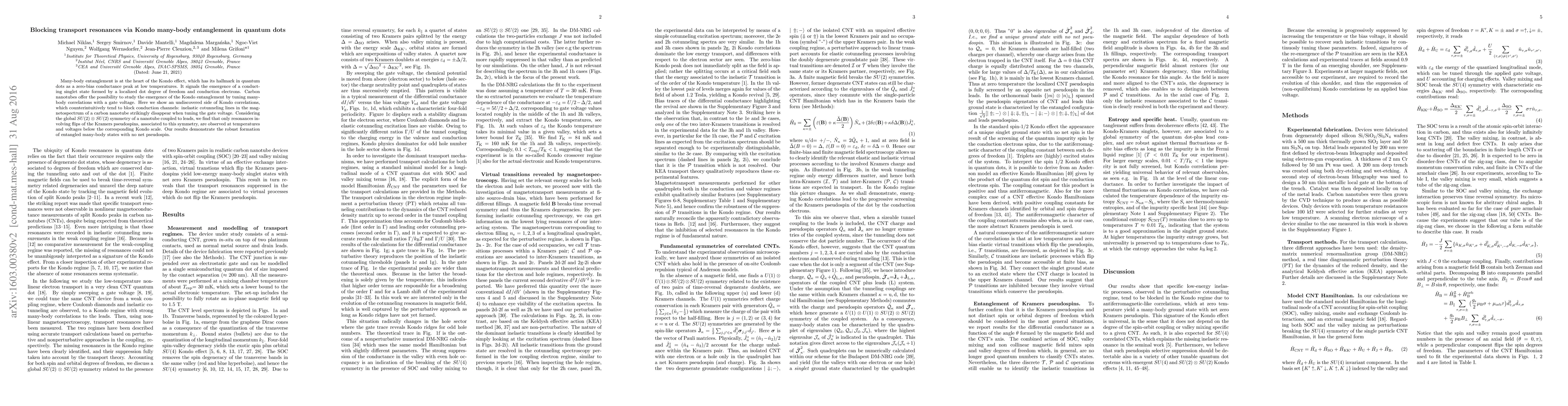 This paper investigates how Kondo entanglement in quantum dots, particularly in carbon nanotubes, can block transport resonances via inelastic cotunneling, revealing that such resonances vanish when the gate voltage tunes the many-body correlations. The study highlights that only resonances associated with flips of Kramers pseudospins remain observable under specific conditions, demonstrating the formation of robust, entangled many-body states with no net pseudospin.
