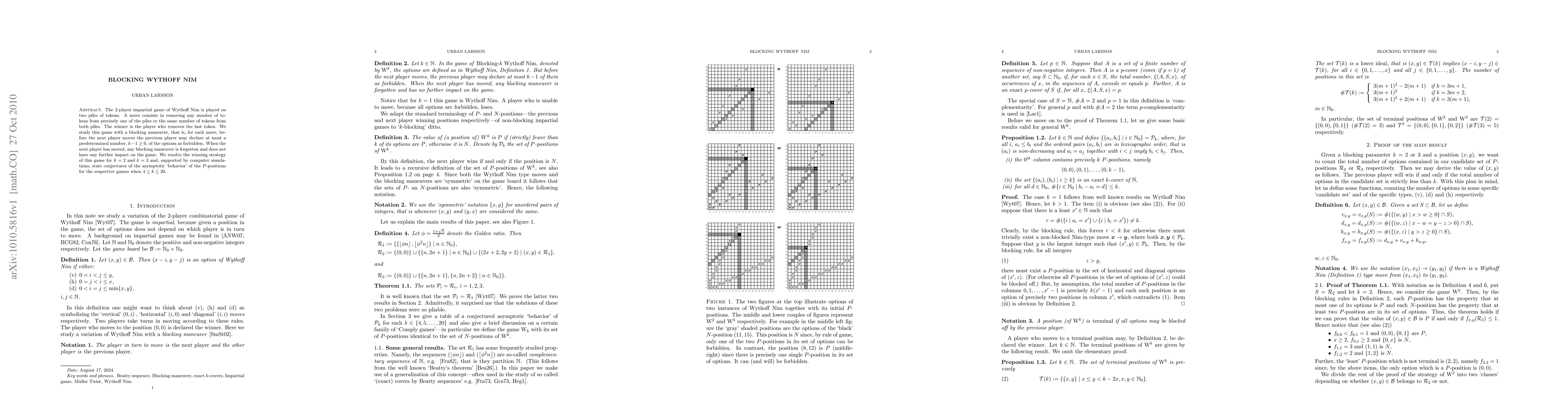 Researchers study a variation of the game Wythoff Nim where players can block each other's moves by declaring a limited number of forbidden options, finding winning strategies for $k=2$ and $k=3$, and conjecturing asymptotic behavior for $4 imes 20$.