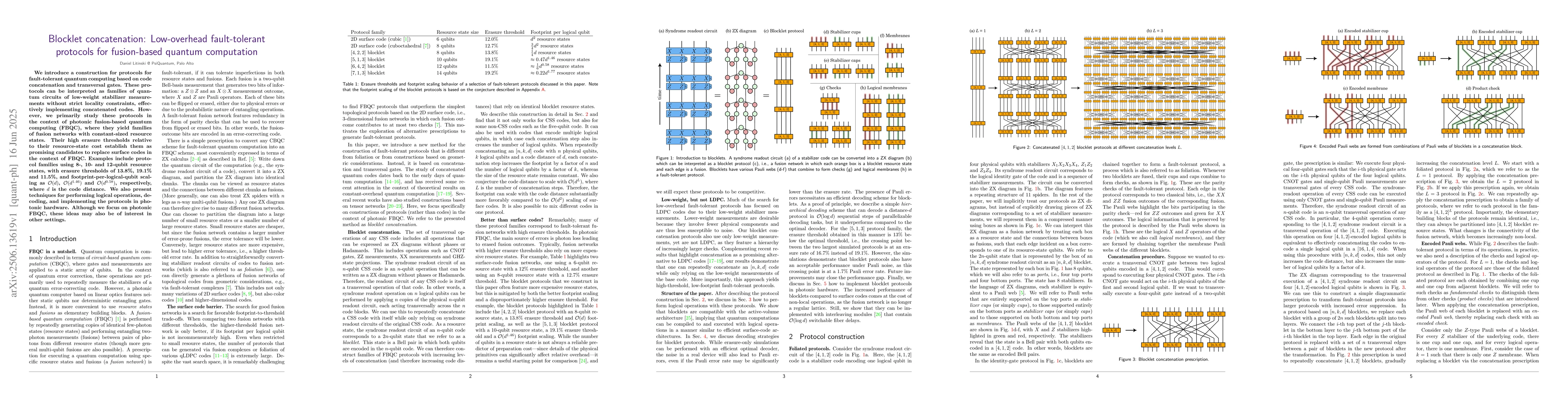 We introduce a construction for protocols for fault-tolerant quantum computing based on code concatenation and transversal gates. These protocols can be interpreted as families of quantum circuits of low-weight stabilizer measurements without strict locality constraints, effectively implementing concatenated codes. However, we primarily study these protocols in the context of photonic fusion-based quantum computing (FBQC), where they yield families of fusion networks with constant-sized resource states. Their high erasure thresholds relative to their resource-state cost establish them as promising candidates to replace surface codes in the context of FBQC. Examples include protocol families using 8-, 10- and 12-qubit resource states, with erasure thresholds of 13.8%, 19.1% and 11.5%, and footprint-per-logical-qubit scaling as $\mathcal{O}(d)$, $\mathcal{O}(d^{1.46})$ and $\mathcal{O}(d^{0.58})$, respectively, where $d$ is the code distance. We also present techniques for performing logical operations, decoding, and implementing the protocols in photonic hardware. Although we focus on photonic FBQC, these ideas may also be of interest in other settings.