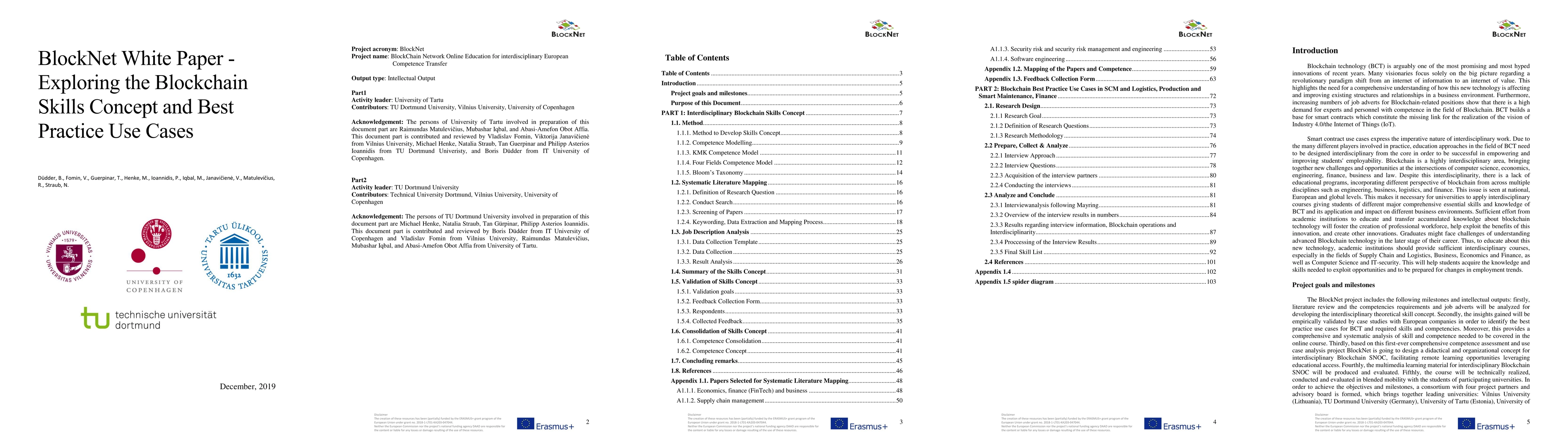 In order to explore the practical potential and needs of interdisciplinary knowledge and competence requirements of Blockchain technology, the project activity "Development of Interdisciplinary Blockchain Skills Concept" starts with the literature review identifying the state of the art of Blockchain in Supply Chain Management and Logistics, Business and Finance, as well as Computer Science and IT-Security. The project activity further explores the academic and industry landscape of existing initiatives in education which offer Blockchain courses. Moreover, job descriptions and adverts are analyzed in order to specify today's competence requirements from enterprises. To discuss and define the future required competence, expert workshops are organized to validate the findings by academic experts. Based on the research outcome and validation, an interdisciplinary approach for Blockchain competence is developed. A second part focuses on the development of the Blockchain Best Practices activity while conducting qualitative empirical research based on case studies with industry representatives. Therefore, company interviews, based on the theoretical basis of Output 1, explore existing Blockchain use cases in different sectors. Due to the interdisciplinary importance of Blockchain technology, these skills will be defined by different perspectives of Blockchain from across multiple mentioned disciplines. The use cases and companies for the interviews will be selected based on various sampling criteria to gain results valid for a broad scale. The analysis of the various use cases will be conducted and defined in a standardized format to identify the key drivers and competence requirements for Blockchain technology applications and their adoption. On the one hand, this approach ensures comparability, on the other hand, it facilitates the development of a structured and systematic framework.