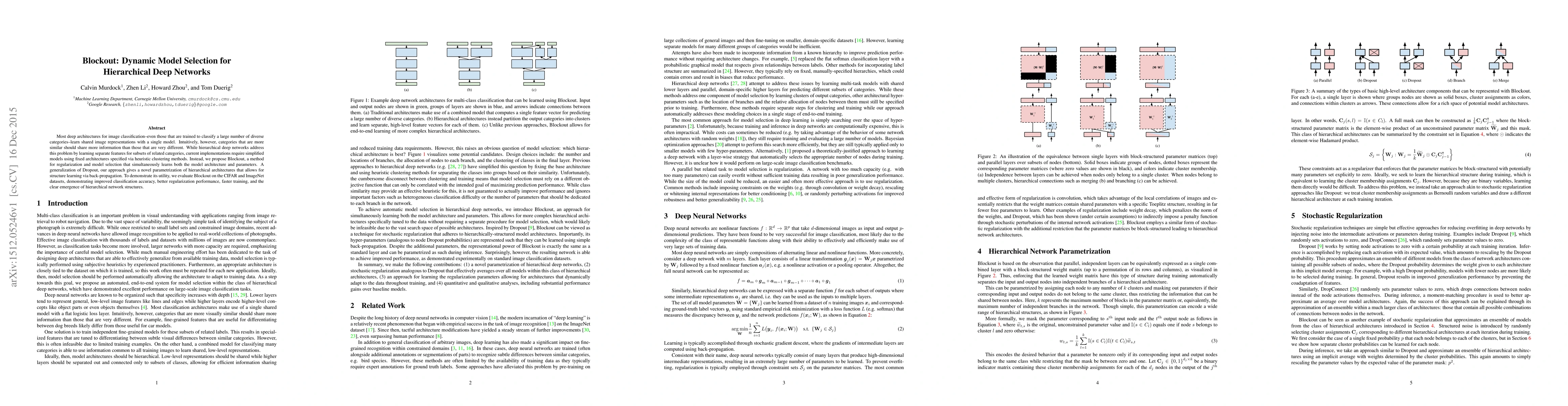 Most deep architectures for image classification--even those that are trained to classify a large number of diverse categories--learn shared image representations with a single model. Intuitively, however, categories that are more similar should share more information than those that are very different. While hierarchical deep networks address this problem by learning separate features for subsets of related categories, current implementations require simplified models using fixed architectures specified via heuristic clustering methods. Instead, we propose Blockout, a method for regularization and model selection that simultaneously learns both the model architecture and parameters. A generalization of Dropout, our approach gives a novel parametrization of hierarchical architectures that allows for structure learning via back-propagation. To demonstrate its utility, we evaluate Blockout on the CIFAR and ImageNet datasets, demonstrating improved classification accuracy, better regularization performance, faster training, and the clear emergence of hierarchical network structures.