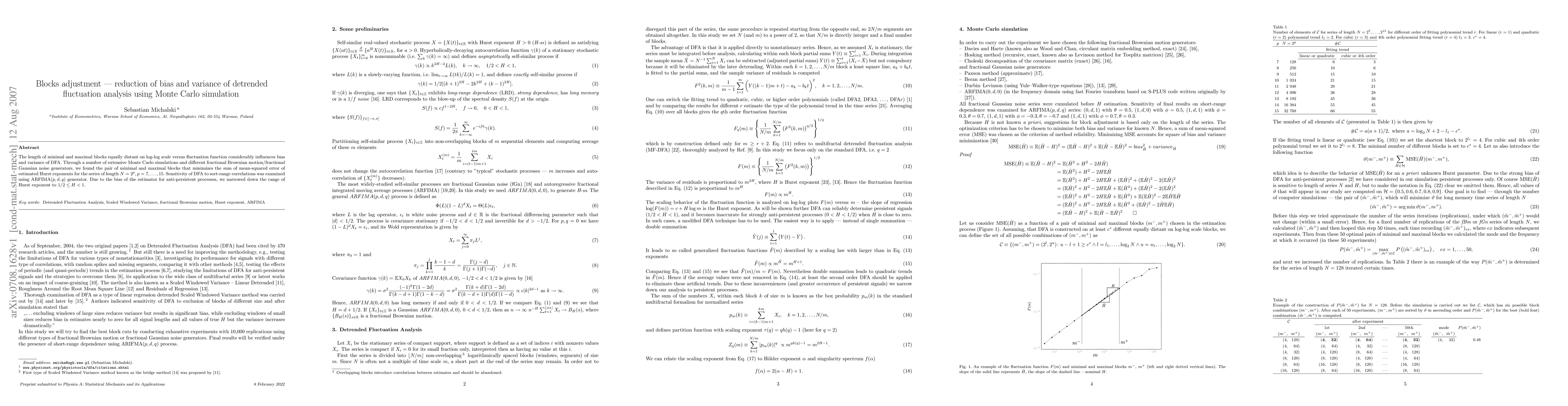 The length of minimal and maximal blocks equally distant on log-log scale versus fluctuation function considerably influences bias and variance of DFA. Through a number of extensive Monte Carlo simulations and different fractional Brownian motion/fractional Gaussian noise generators, we found the pair of minimal and maximal blocks that minimizes the sum of mean-squared error of estimated Hurst exponents for the series of length N=2^p, p=7,...,15. Sensitivity of DFA to sort-range correlations was examined using ARFIMA(p,d,q) generator. Due to the bias of the estimator for anti-persistent processes, we narrowed down the range of Hurst exponent to 1/2<=H< 1.