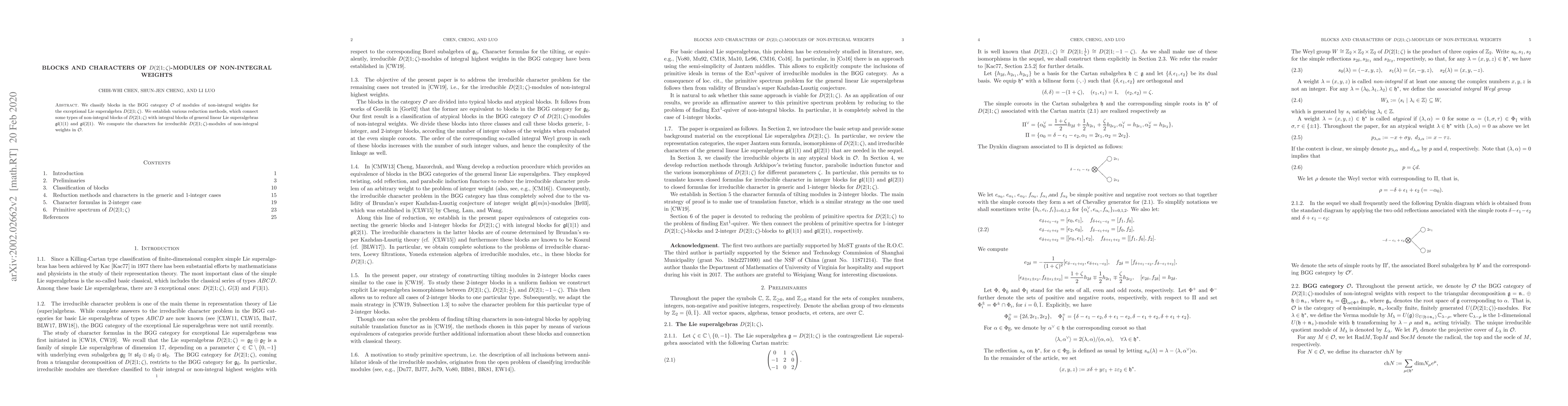 The research employs classification of blocks in the BGG category $\mathcal{O}$ for non-integral weights of the exceptional Lie superalgebra $D(2|1;\zeta)$, using reduction methods to connect these blocks with integral blocks of general linear Lie superalgebras $\mathfrak{gl}(1|1)$ and $\mathfrak{gl}(2|1)$, and computing characters for irreducible $D(2|1;\zeta)$-modules of non-integral weights.