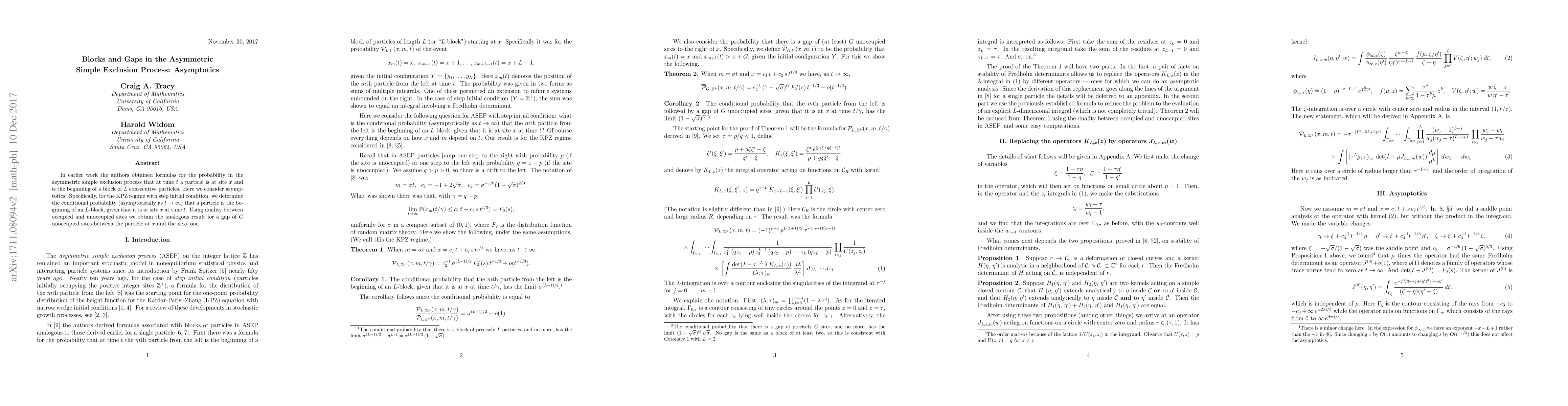In earlier work (arXiv:1707.04927) the authors obtained formulas for the probability in the asymmetric simple exclusion process that at time $t$ a particle is at site $x$ and is the beginning of a block of $L$ consecutive particles. Here we consider asymptotics. Specifically, for the KPZ regime with step initial condition, we determine the conditional probability (asymptotically as $t\rightarrow\infty$) that a particle is the beginning of an $L$-block, given that it is at site $x$ at time $t$. Using duality between occupied and unoccupied sites we obtain the analogous result for a gap of $G$ unoccupied sites between the particle at $x$ and the next one.