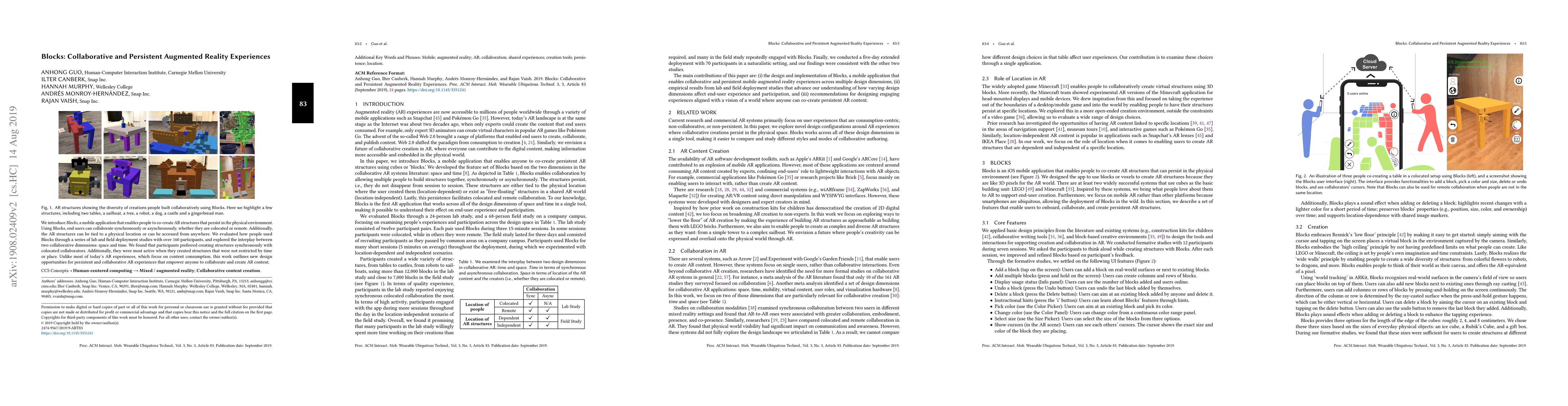 Blocks is a mobile app for collaborative and persistent augmented reality (AR) experiences, allowing users to co-create AR structures that remain in the physical world. Through lab and field studies with over 160 participants, it was found that users preferred synchronous collaboration with colocated partners and were most active when creating unrestricted AR structures, highlighting new design opportunities for collaborative AR.
