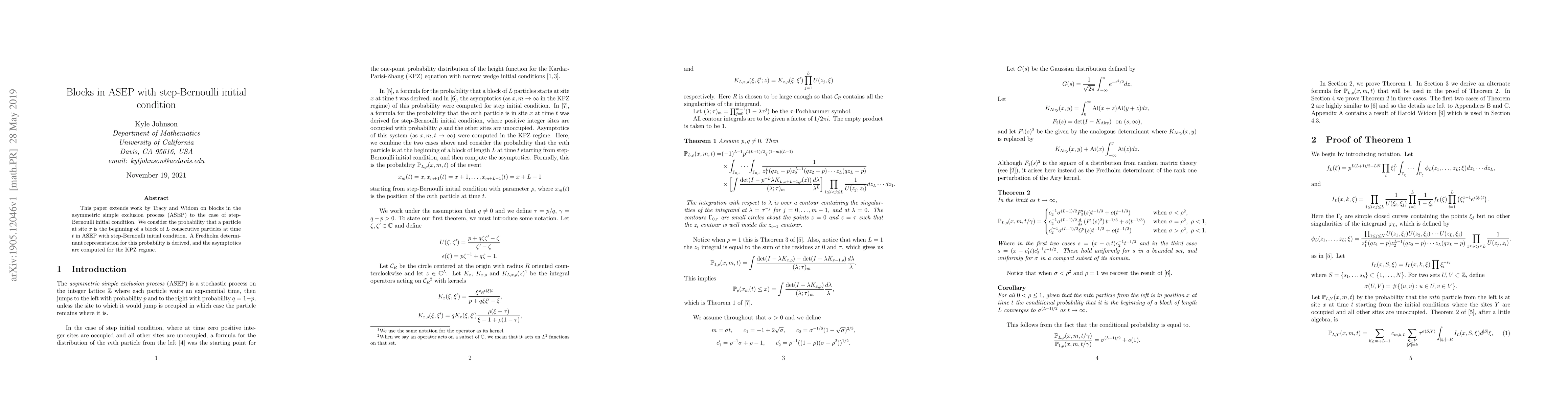 Researchers extended work on the asymmetric simple exclusion process to step-Bernoulli initial conditions, deriving a Fredholm determinant representation for the probability of a particle starting a block of consecutive particles over time.