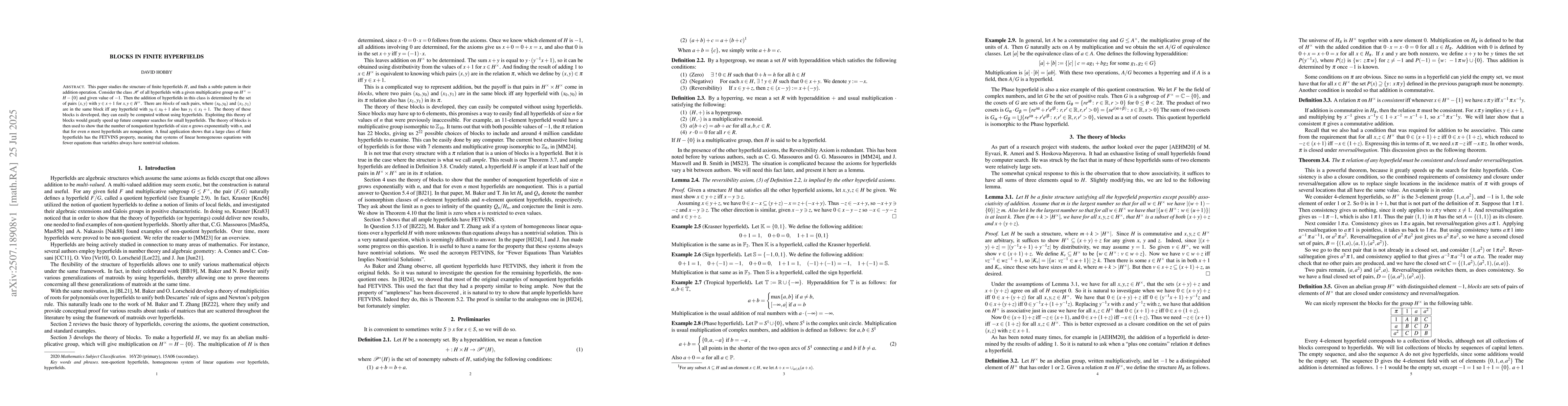 This paper studies the structure of finite hyperfields $H$, and finds a subtle pattern in their addition operation. Consider the class $\mathcal{H}$ of all hyperfields with a given multiplicative group on $H^\times = H - \{0\}$ and given value of $-1$. Then the addition of hyperfields in this class is determined by the set of pairs $(x,y)$ with $y \in x+1$ for $x,y \in H^\times$. There are blocks of such pairs, where $(x_0,y_0)$ and $(x_1,y_1)$ are in the same block iff every hyperfield with $y_0 \in x_0 + 1$ also has $y_1 \in x_1 + 1$. The theory of these blocks is developed, they can easily be computed without using hyperfields. Exploiting this theory of blocks would greatly speed up future computer searches for small hyperfields. The theory of blocks is then used to show that the number of nonquotient hyperfields of size $n$ grows exponentially with $n$, and that for even $n$ most hyperfields are nonquotient. A final application shows that a large class of finite hyperfields has the FETVINS property, meaning that systems of linear homogeneous equations with fewer equations than variables always have nontrivial solutions.