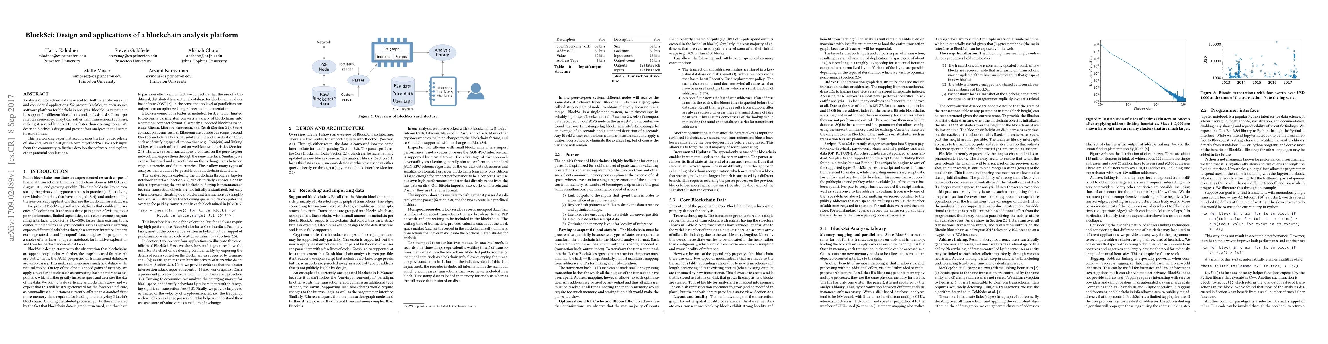 BlockSci is an open-source blockchain analysis platform designed to support diverse blockchains and analytical tasks, featuring an in-memory database for significantly faster performance compared to existing tools. The paper showcases its design and demonstrates its capabilities through four analytical examples.