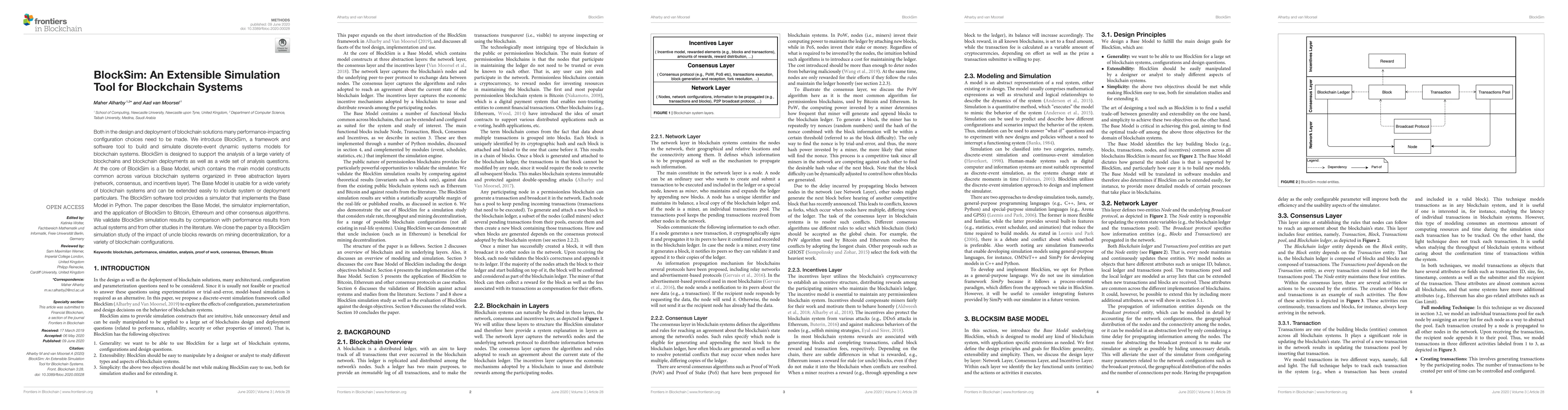 BlockSim is a versatile simulation tool designed to model and analyze blockchain systems, featuring a Base Model for common constructs across various blockchains. The tool supports extensive blockchain analysis and can be extended to specific configurations, validated against real-world performance data.