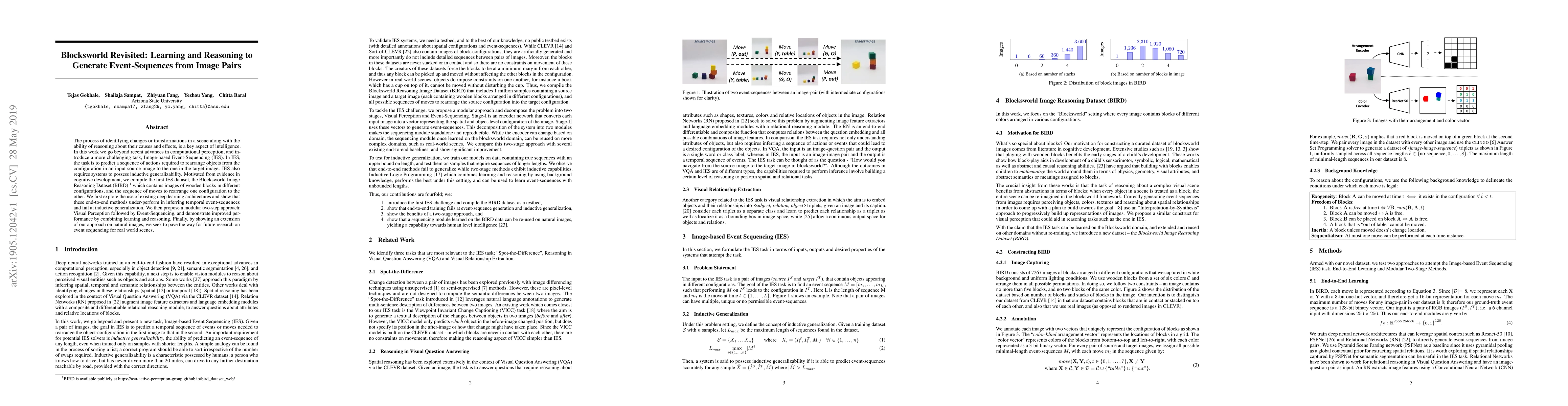 The process of identifying changes or transformations in a scene along with the ability of reasoning about their causes and effects, is a key aspect of intelligence. In this work we go beyond recent advances in computational perception, and introduce a more challenging task, Image-based Event-Sequencing (IES). In IES, the task is to predict a sequence of actions required to rearrange objects from the configuration in an input source image to the one in the target image. IES also requires systems to possess inductive generalizability. Motivated from evidence in cognitive development, we compile the first IES dataset, the Blocksworld Image Reasoning Dataset (BIRD) which contains images of wooden blocks in different configurations, and the sequence of moves to rearrange one configuration to the other. We first explore the use of existing deep learning architectures and show that these end-to-end methods under-perform in inferring temporal event-sequences and fail at inductive generalization. We then propose a modular two-step approach: Visual Perception followed by Event-Sequencing, and demonstrate improved performance by combining learning and reasoning. Finally, by showing an extension of our approach on natural images, we seek to pave the way for future research on event sequencing for real world scenes.