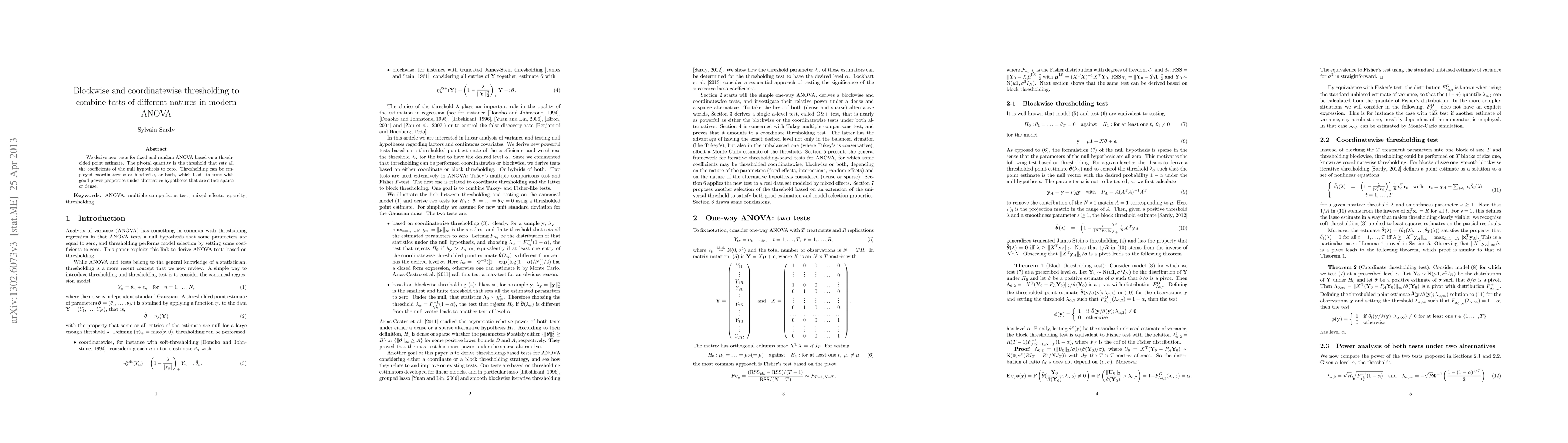The paper derives new tests for fixed and random ANOVA based on thresholded point estimates, employing both blockwise (2-norm) and coordinatewise (∞-norm) thresholding. These tests are shown to have good power properties under sparse or dense alternatives.