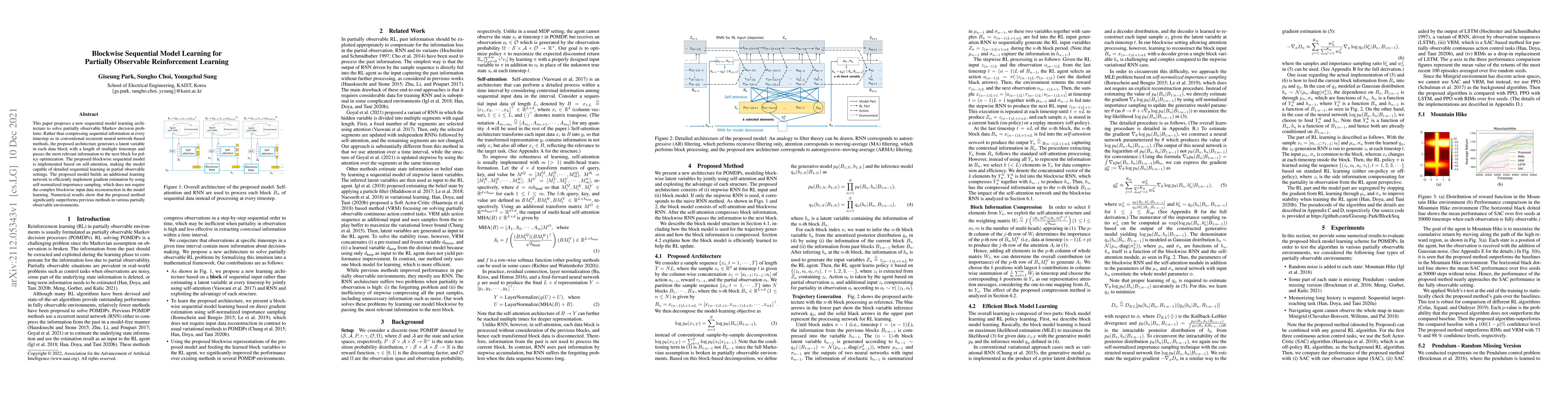This paper introduces a blockwise sequential model learning architecture for partially observable reinforcement learning, utilizing self-attention to generate latent variables in data blocks and optimize policy, outperforming previous methods in various environments. The model includes a learning network for efficient gradient estimation via self-normalized importance sampling.