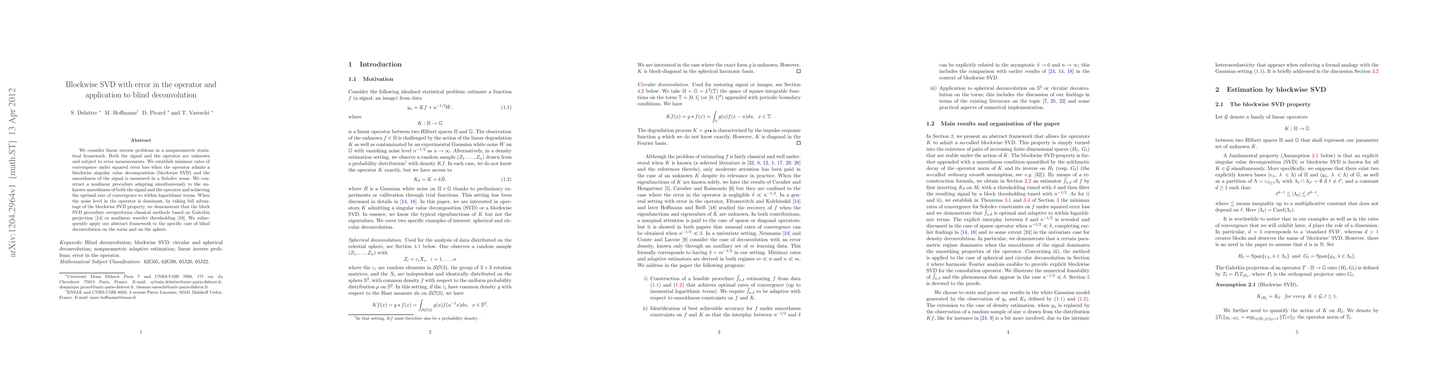 We consider linear inverse problems in a nonparametric statistical framework. Both the signal and the operator are unknown and subject to error measurements. We establish minimax rates of convergence under squared error loss when the operator admits a blockwise singular value decomposition (blockwise SVD) and the smoothness of the signal is measured in a Sobolev sense. We construct a nonlinear procedure adapting simultaneously to the unknown smoothness of both the signal and the operator and achieving the optimal rate of convergence to within logarithmic terms. When the noise level in the operator is dominant, by taking full advantage of the blockwise SVD property, we demonstrate that the block SVD procedure overperforms classical methods based on Galerkin projection or nonlinear wavelet thresholding. We subsequently apply our abstract framework to the specific case of blind deconvolution on the torus and on the sphere.