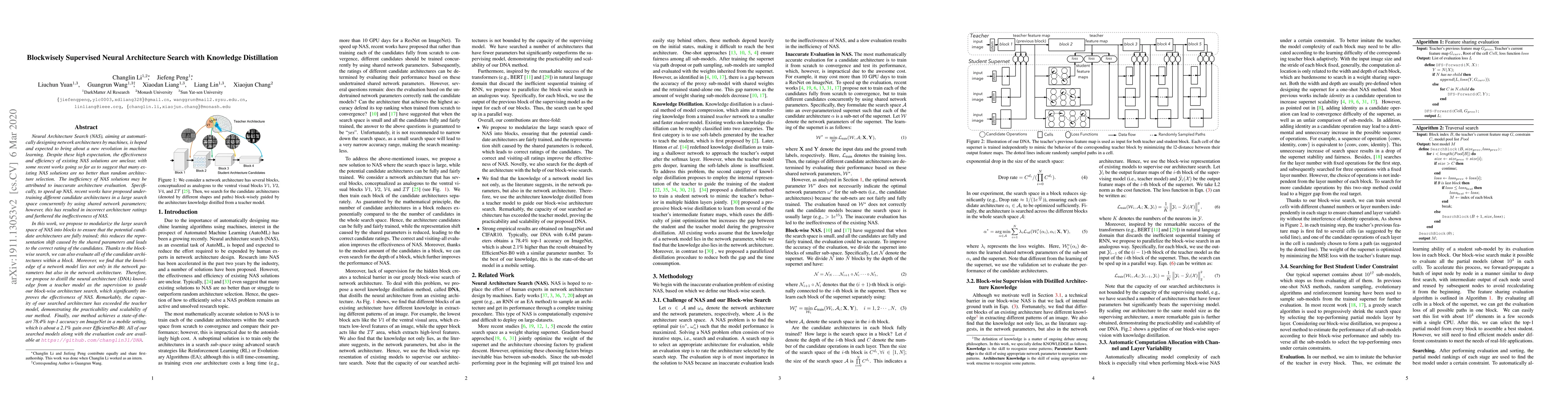 This paper proposes a blockwise supervised neural architecture search method with knowledge distillation to improve NAS efficiency and effectiveness. By fully training candidate architectures in modular blocks and using neural architecture knowledge from a teacher model, the method achieves a state-of-the-art 78.4% top-1 accuracy on ImageNet in a mobile setting, outperforming EfficientNet-B0 by 2.1%.