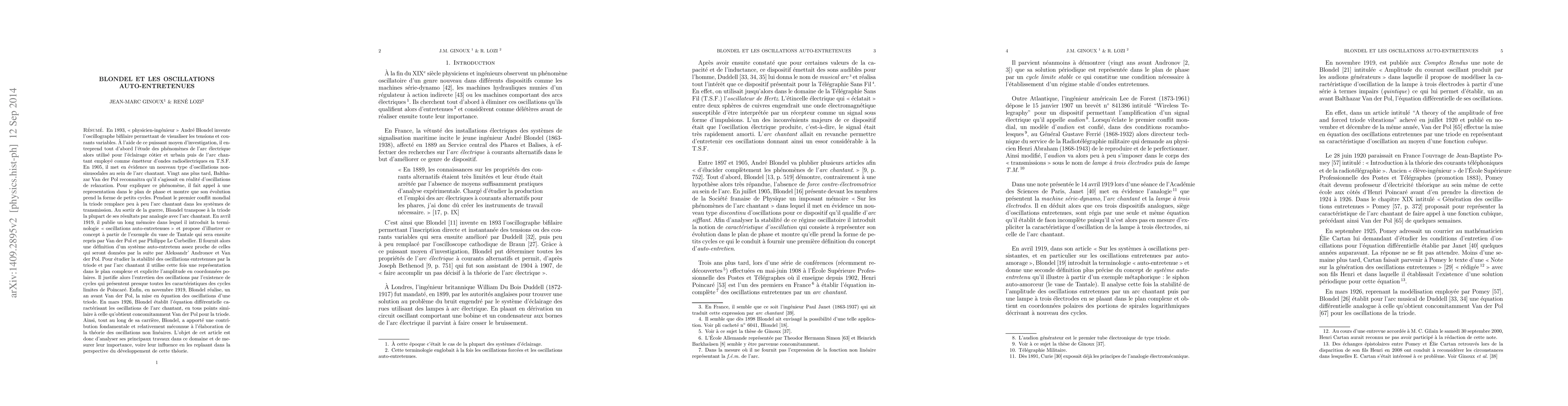 In 1893, the "physicist-engineer" Andr\'e Blondel invents the oscilloscope for displaying voltage and current variables. With this powerful means of investigation, he first studies the phenomena of the arc then used for the coastal and urban lighting and then, the singing arc used as a transmitter of radio waves in wireless telegraphy. In 1905, he highlights a new type of non-sinusoidal oscillations in the singing arc. Twenty years later, Balthasar van der Pol will recognize that such oscillations were in fact "relaxation oscillations". To explain this phenomenon, he uses a representation in the phase plane and shows that its evolution takes the form of small cycles. During World War I the triode gradually replaces the singing arc in transmission systems. At the end of the war, using analogy, Blondel transposes to the triode most of the results he had obtained for the singing arc. In April 1919, he publishes a long memoir in which he introduces the terminology "self-sustained oscillations" and proposes to illustrate this concept starting from the example of the Tantalus cup which is then picked up by Van der Pol and Philippe Le Corbeiller. He then provides the definition of a self sustained system which is quite similar to that given later by Aleksandr Andronov and Van der Pol. To study the stability of oscillations sustained by the triode and by the singing arc he uses, this time, a representation in the complex plane and he expresses the amplitude in polar coordinates. He then justifies the maintaining of oscillations by the existence cycles which nearly present all the features of Poincar\'e's limit cycles. Finally, in November 1919, Blondel performs, a year before Van der Pol, the setting in equation of the triode oscillations. In March 1926, Blondel establishes the differential equation characterizing the oscillations of the singing arc, completely similar to that obtained concomitantly by Van der Pol for the triode. Thus, throughout his career, Blondel, has made fundamental and relatively unknown contributions to the development of the theory of nonlinear oscillations. The purpose of this article is to analyze his main work in this area and to measure their importance or influence by placing them in the perspective of the development of this theory.