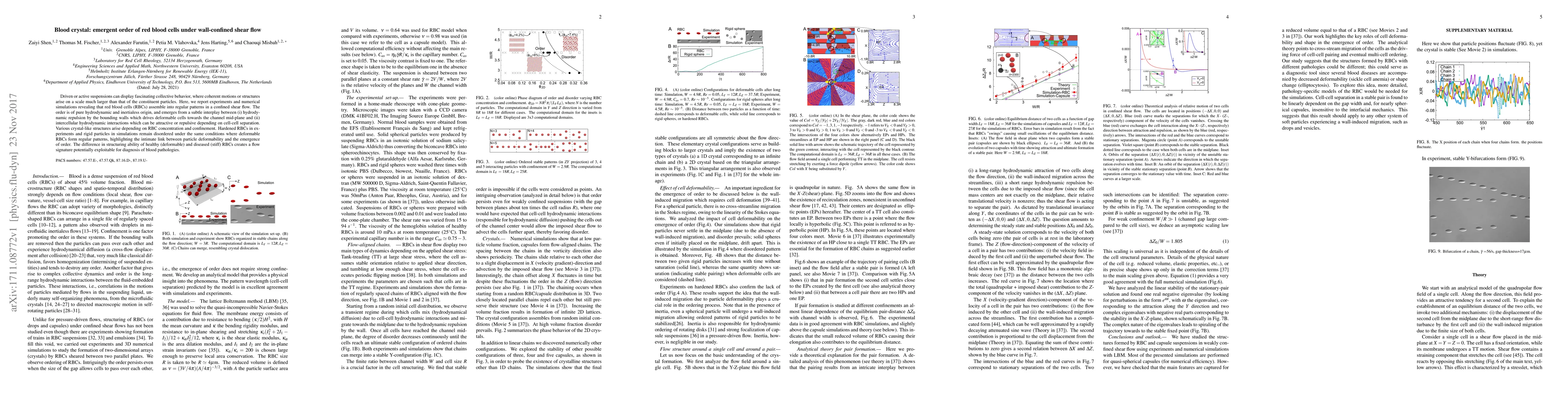 The paper presents an analytical model of the quadrupolar flow field around a single cell, combined with numerical simulations using LBM, to explain the establishment of equilibrium distance between cells in confined shear flow.
