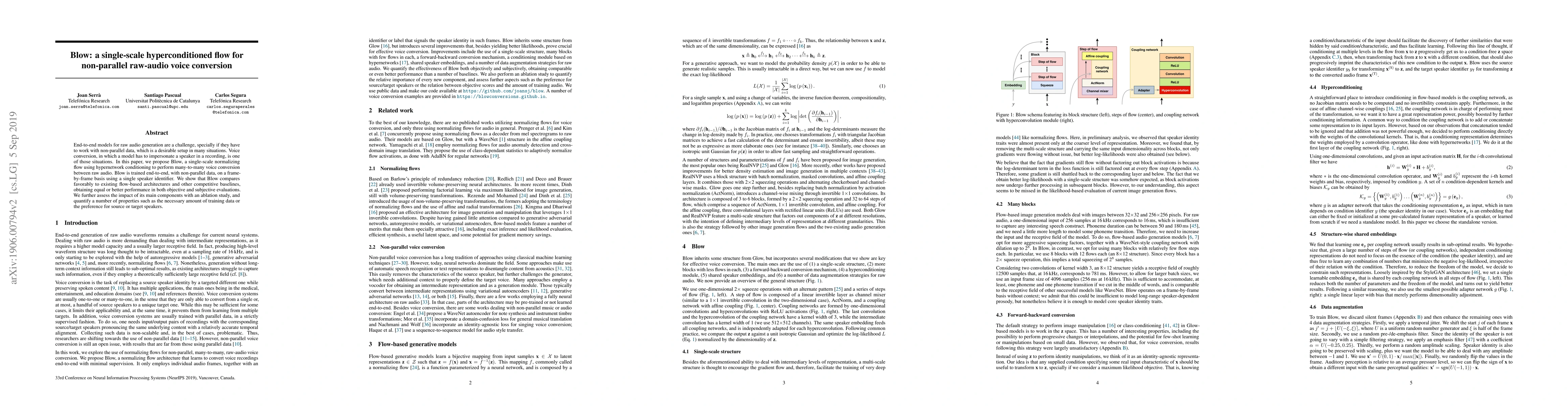 End-to-end models for raw audio generation are a challenge, specially if they have to work with non-parallel data, which is a desirable setup in many situations. Voice conversion, in which a model has to impersonate a speaker in a recording, is one of those situations. In this paper, we propose Blow, a single-scale normalizing flow using hypernetwork conditioning to perform many-to-many voice conversion between raw audio. Blow is trained end-to-end, with non-parallel data, on a frame-by-frame basis using a single speaker identifier. We show that Blow compares favorably to existing flow-based architectures and other competitive baselines, obtaining equal or better performance in both objective and subjective evaluations. We further assess the impact of its main components with an ablation study, and quantify a number of properties such as the necessary amount of training data or the preference for source or target speakers.