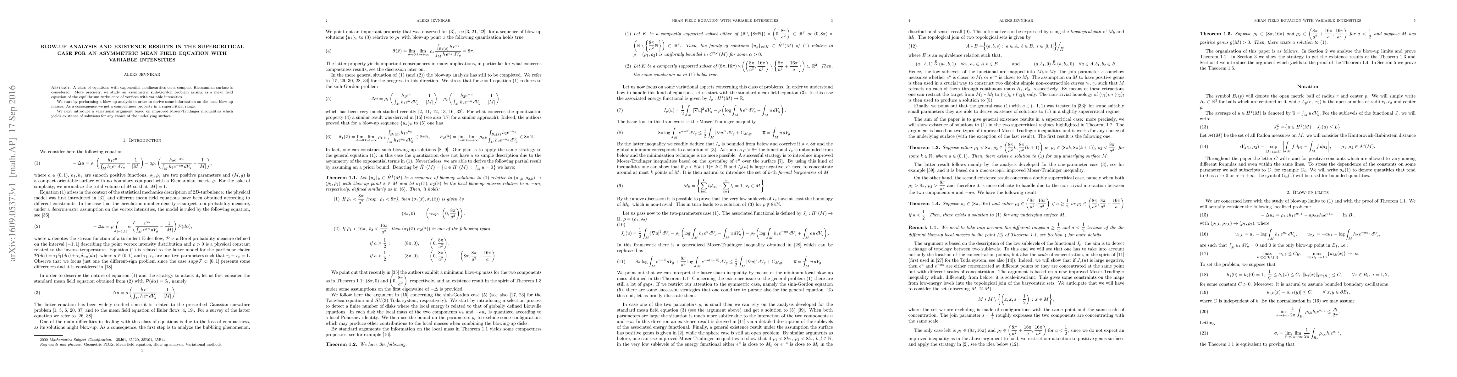 A class of equations with exponential nonlinearities on a compact Riemannian surface is considered. More precisely, we study an asymmetric sinh-Gordon problem arising as a mean field equation of the equilibrium turbulence of vortices with variable intensities. We start by performing a blow-up analysis in order to derive some information on the local blow-up masses. As a consequence we get a compactness property in a supercritical range. We next introduce a variational argument based on improved Moser-Trudinger inequalities which yields existence of solutions for any choice of the underlying surface.